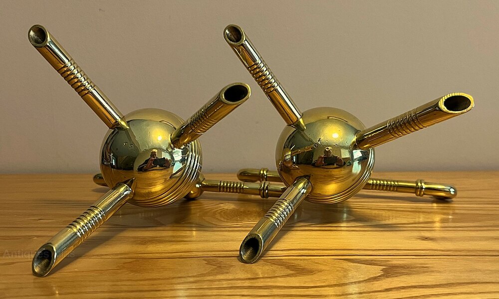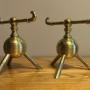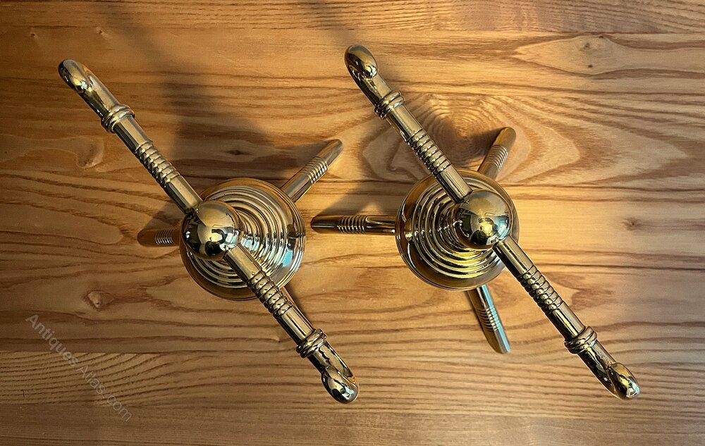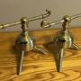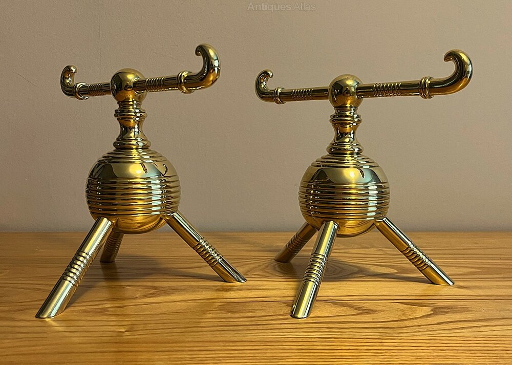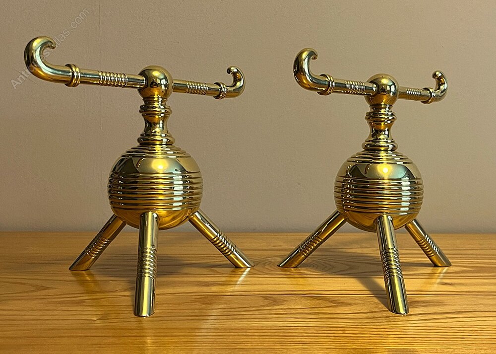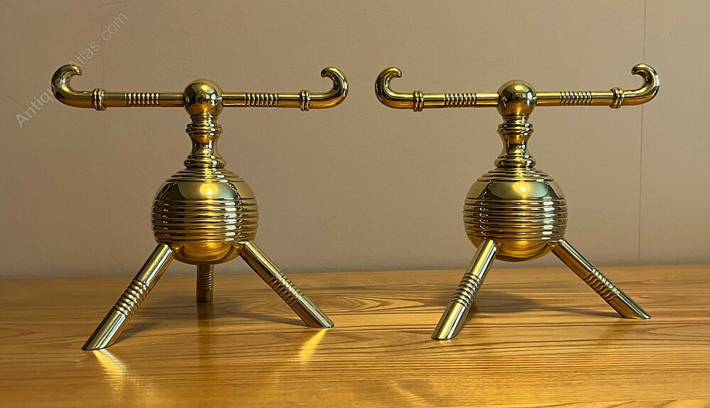 A pair of brass fire dogs designed by Dr Christopher Dresser and manufactured by Benham and Froud dating to around 1880. As can be seen in the photos, they are in excellent condition. The fire dogs have been professionally cleaned and polished and finished with a high quality clear wax. They measure 16.5 cm in height and 19 cm wide.If you have any questions, please get in touch.