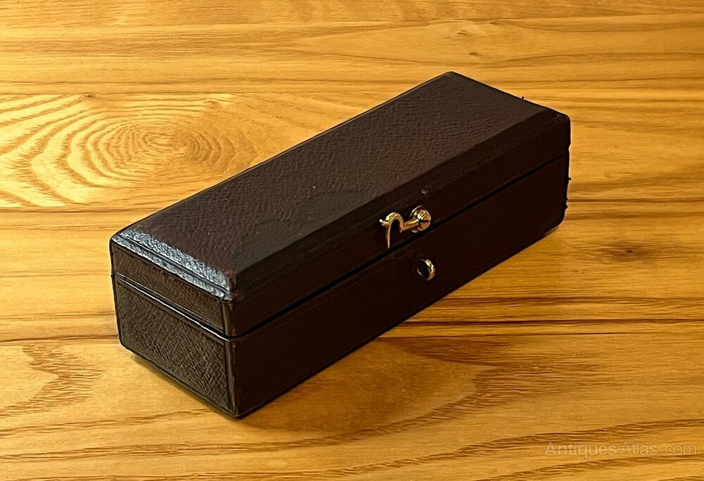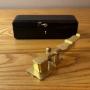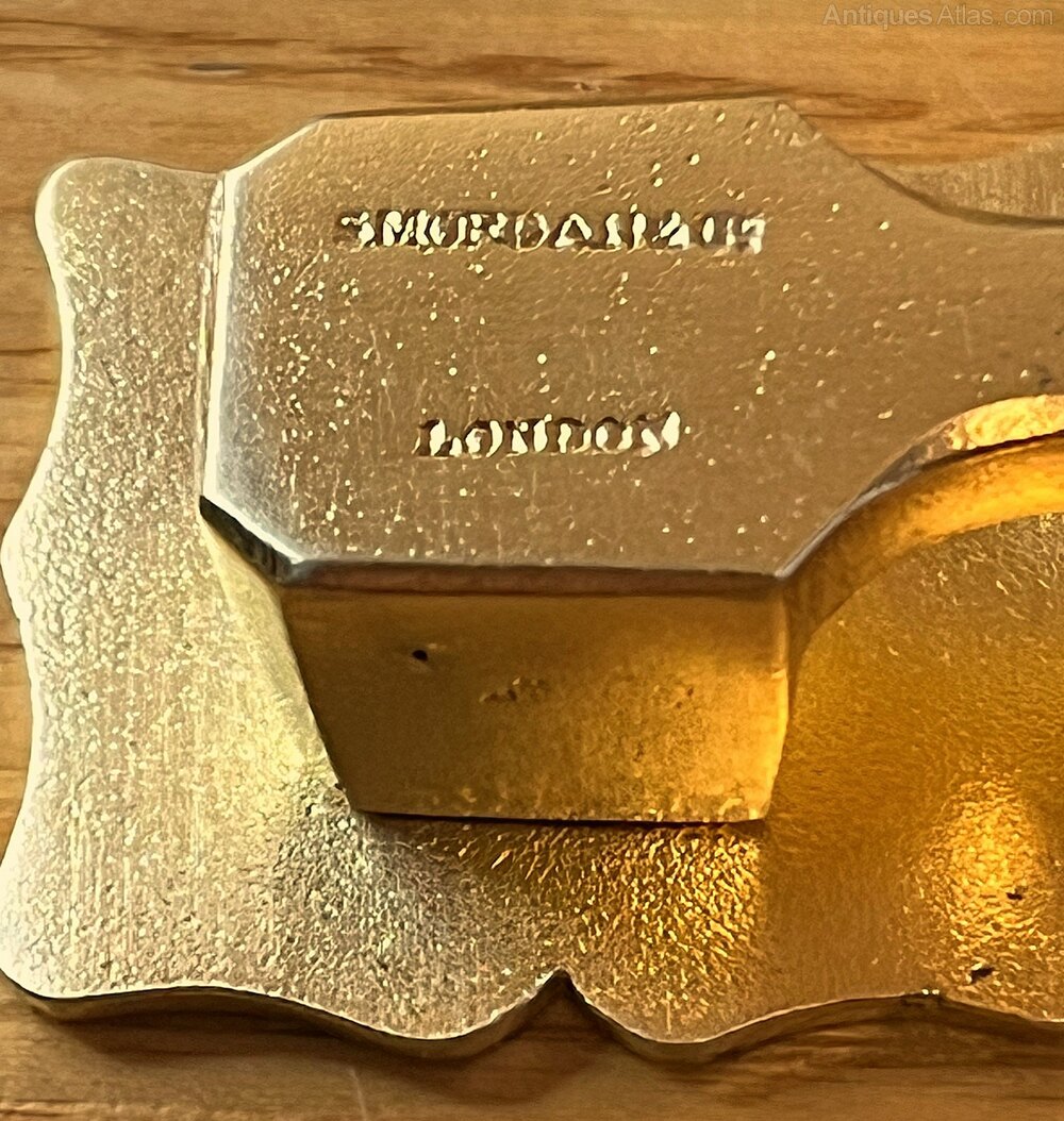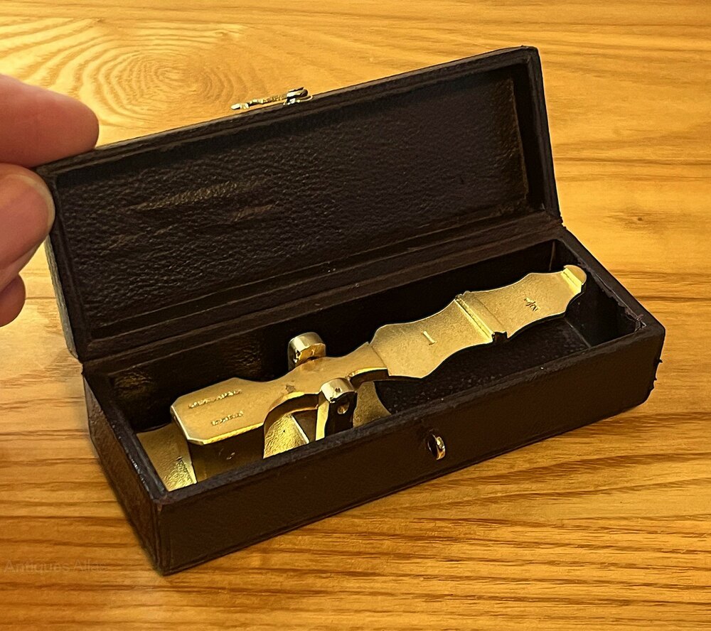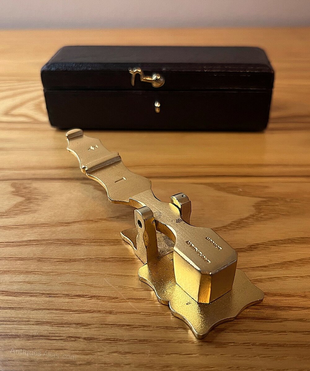 A fabulous set of sovereign rocker scales by Sampson Mordan dating to around 1850. As can be seen in the photos, the scales are in very good condition with little wear to the gilding. The scales come in their original burgundy Moroccan leather box which is also in very good condition. The scales measure 9.5 cm in length, a maximum of 2.3 cm width at the base, and stand 2 cm in height at the fulcrum. The box measures 10.8 cm wide, 3.9 cm deep, and 3.3 cm high. A scarce set of sovereign scales in lovely condition.If you have any questions, please get in touch.
