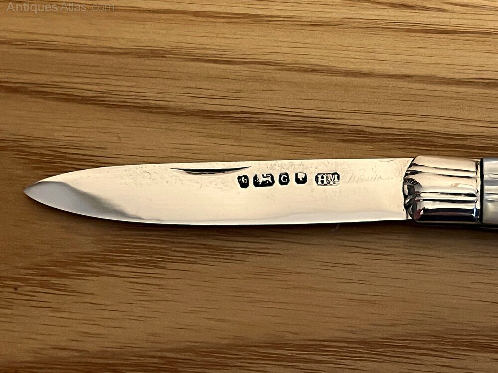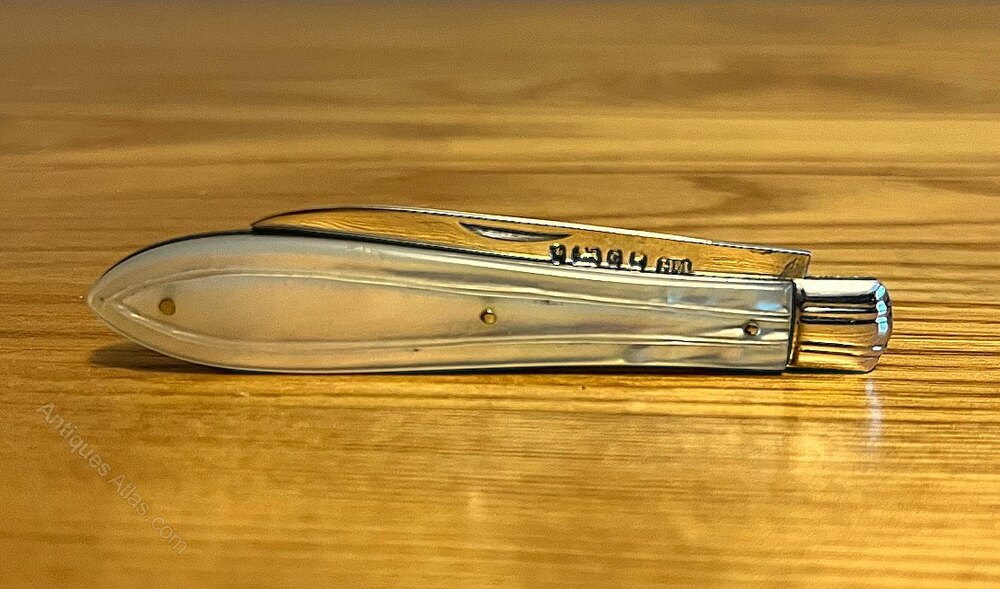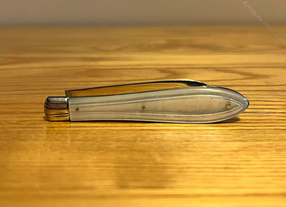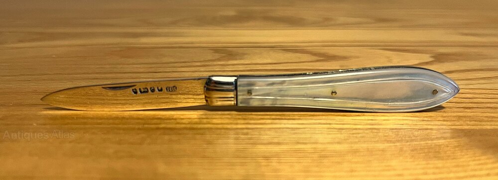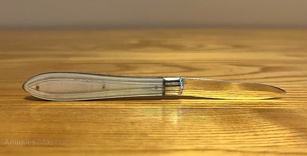 A small silver-bladed fruit knife with mother-of-pearl handle by Atkin Brothers, Sheffield, 1870. The blade is in good condition and the mother-of pearl handle is free from chips, scratches or cracks. The knife measures 7.3 cm when closed and 12.1 cm opened.If you have any questions, please get in touch.