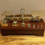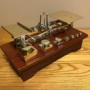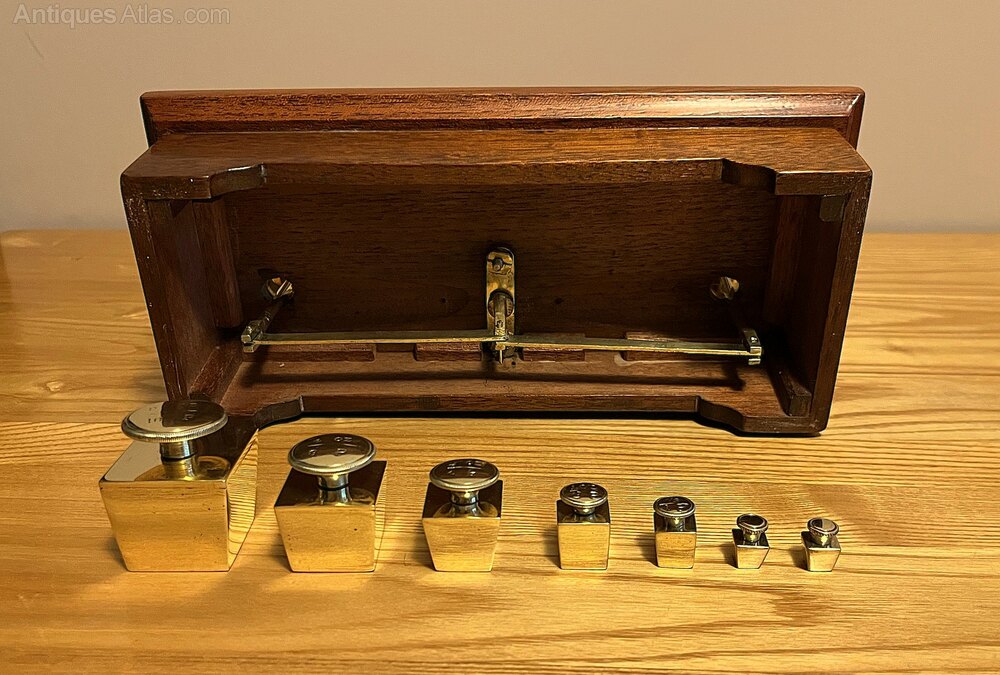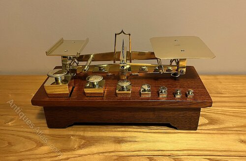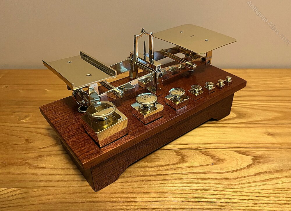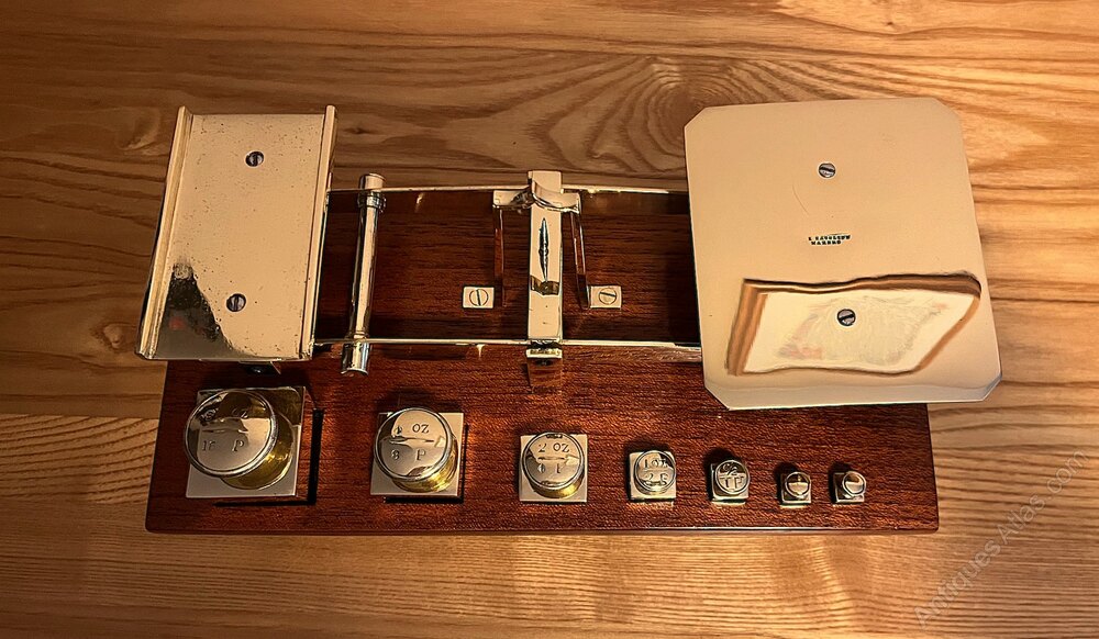 A beautiful set of postal scales by Edmund Ratcliff dating to around 1880. As can be seen in the photos, the scales are in lovely antique condition with all cube-shaped weights present. Ratcliff were the only makers to produce weights in this shape. Stamped to the brass letter platform is E. RATCLIFF MAKERS. The scales balance nicely and all parts have been cleaned, polished and waxed. The mahogany base measures 25.5 cm wide as has a depth of 11.8 cm. The maximum height of the scales (including the base) is 14 cm.If you have any questions, please get in touch.