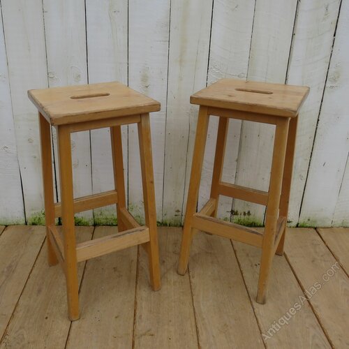 Tall pair of sound and sturdy vintage English industrial beech wood hand held school lab dining bar stools. Six available.Shipping information