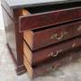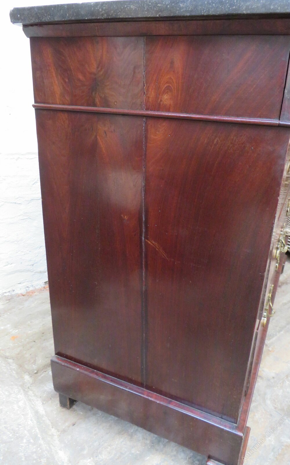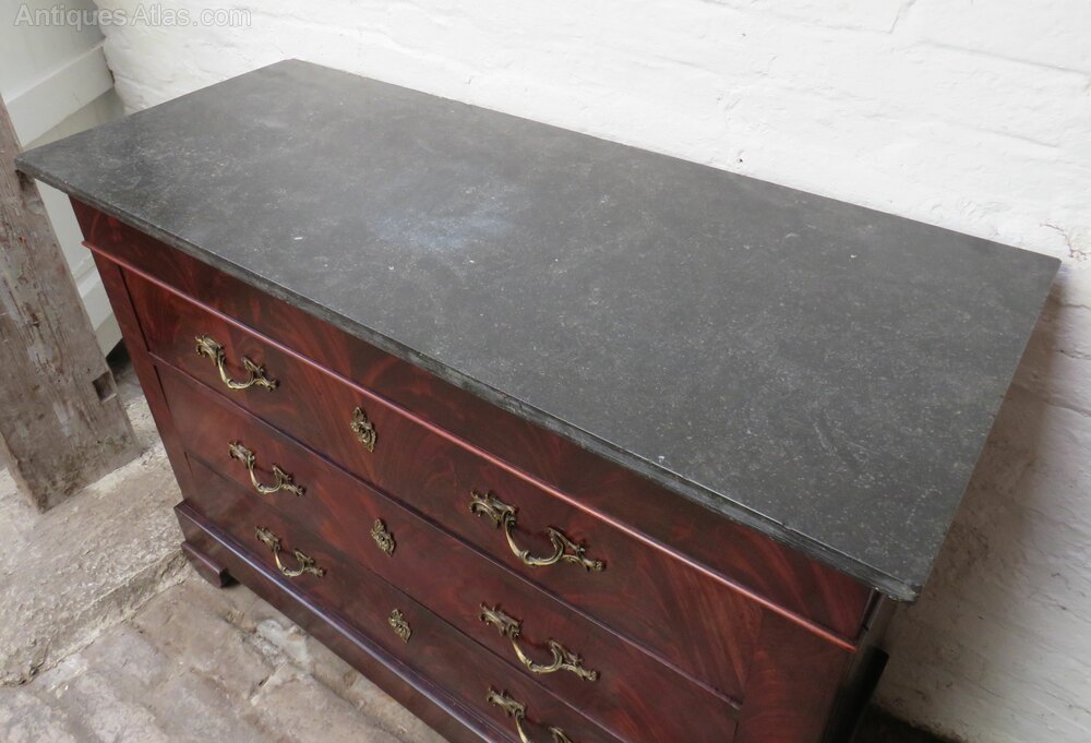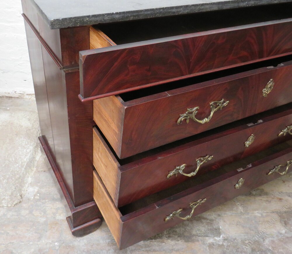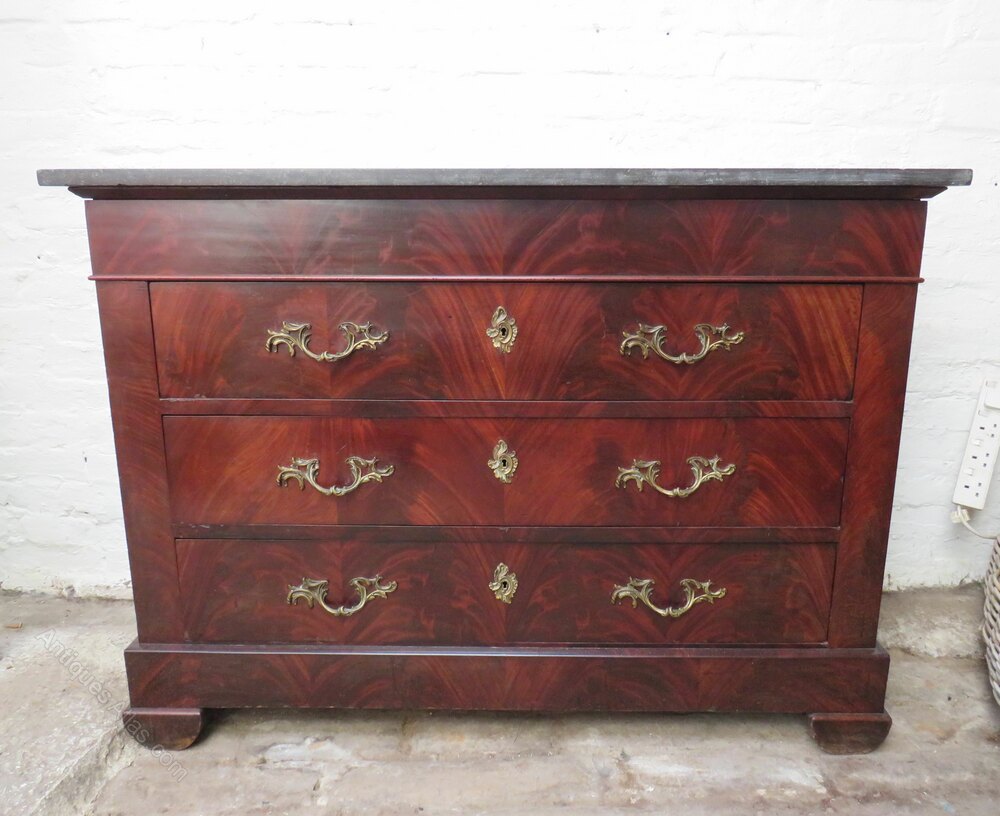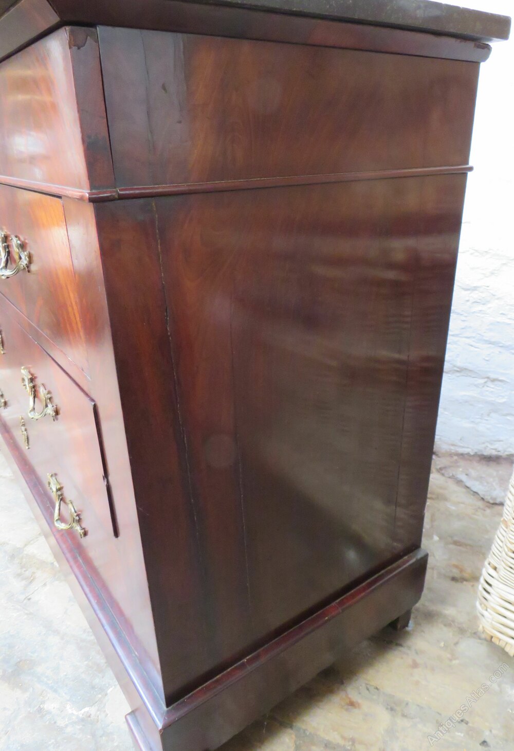 Shapely, sound and sturdy 19th century French four drawer flame mahogany and marble top commode, chest of drawers. More images available.Shipping information