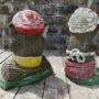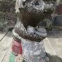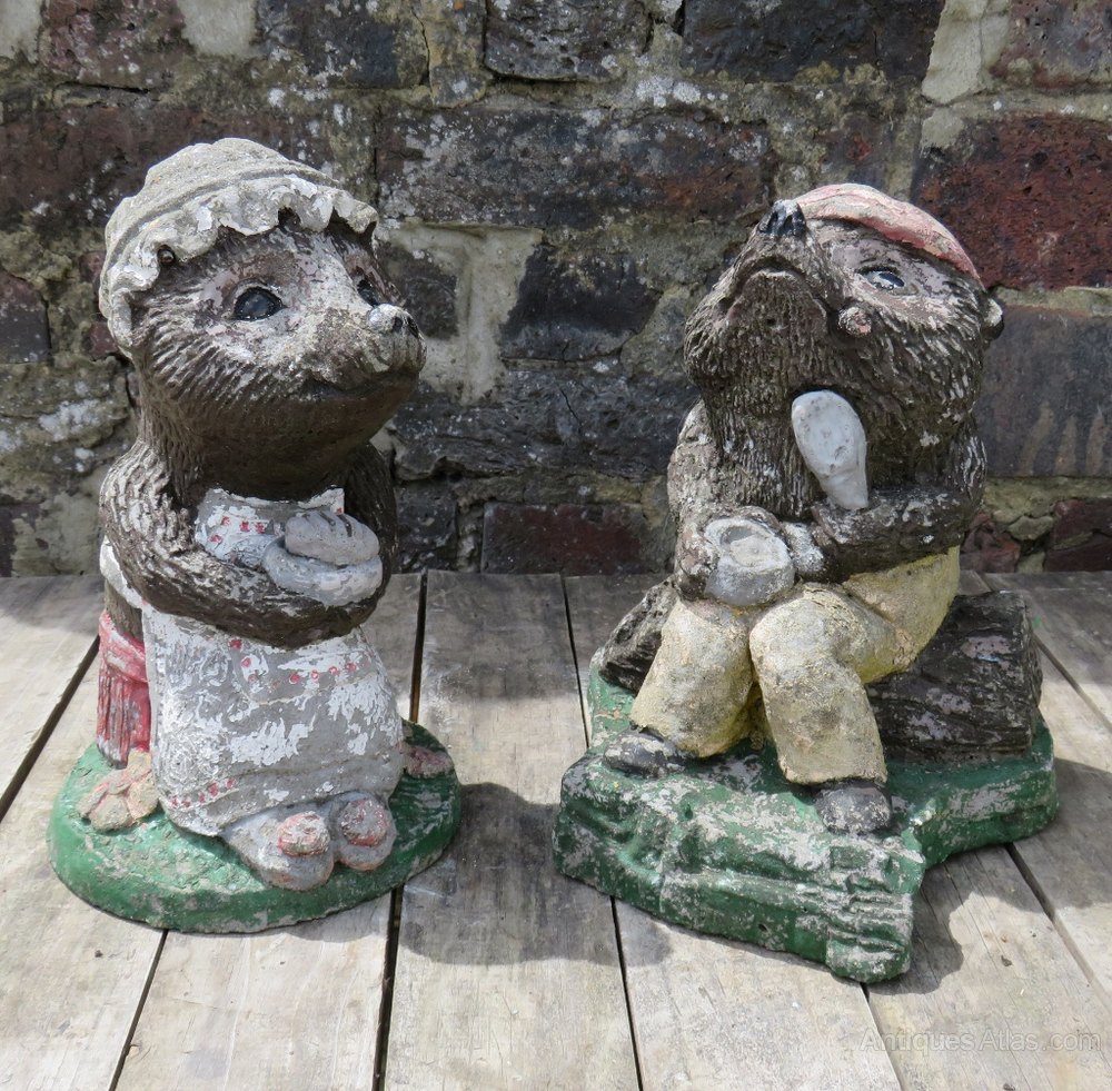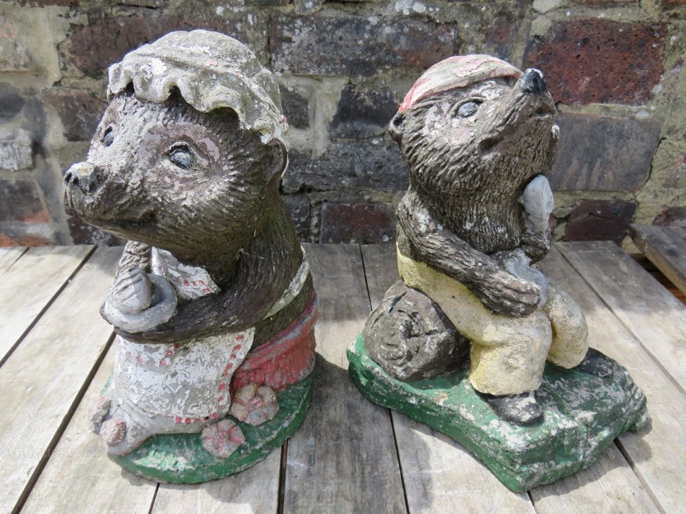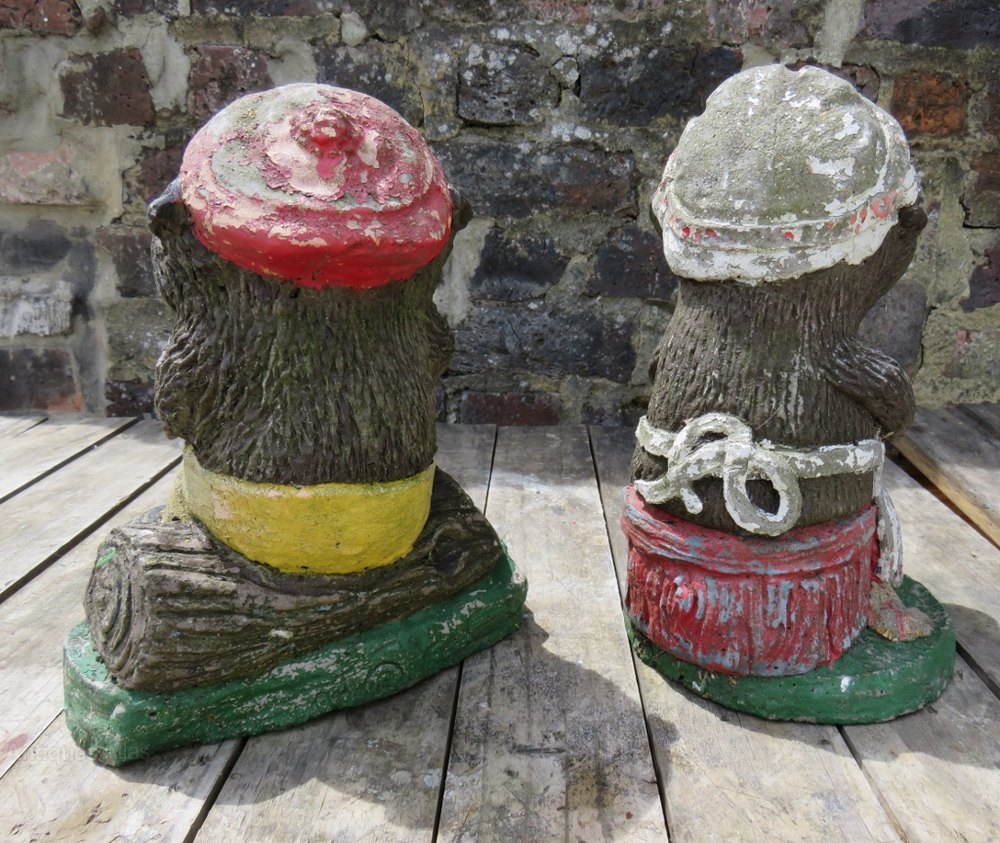 Pair of vintage English decorative reconstituted stone weathered garden hedgehogs in original paint.Shipping information