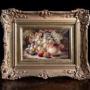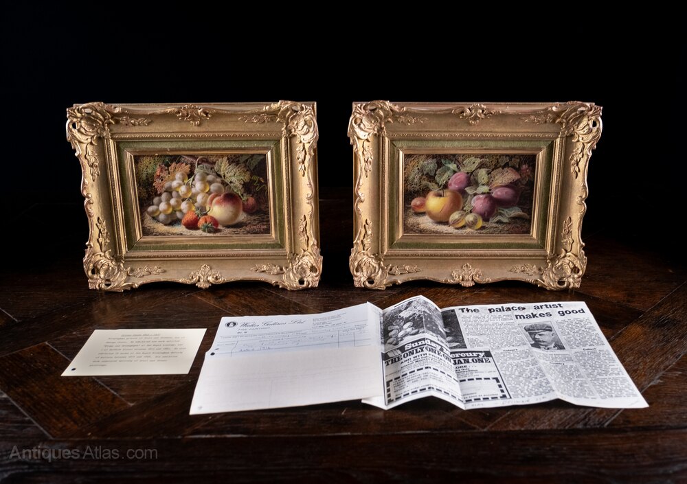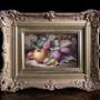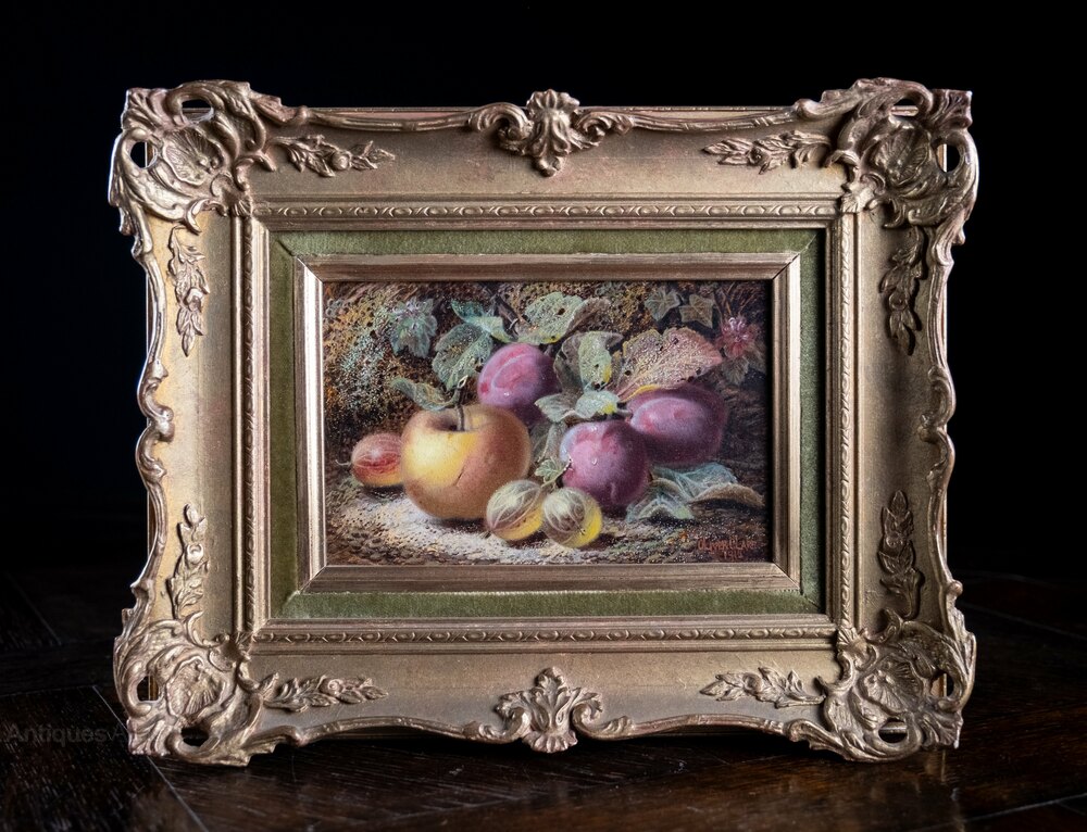 This delightful pair of oils by Clare depict various fruits to include plums, apples, peaches and strawberries to name a few, before a background of moss and foliage. Both oils exhibit Clare's trademark painting style of invisible brush strokes and water droplets that look as if they might be wiped away. Both works are signed and dated '1916' to the lower right.