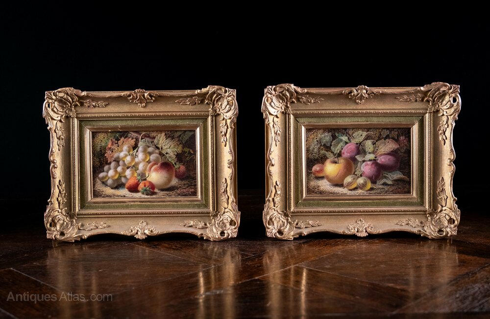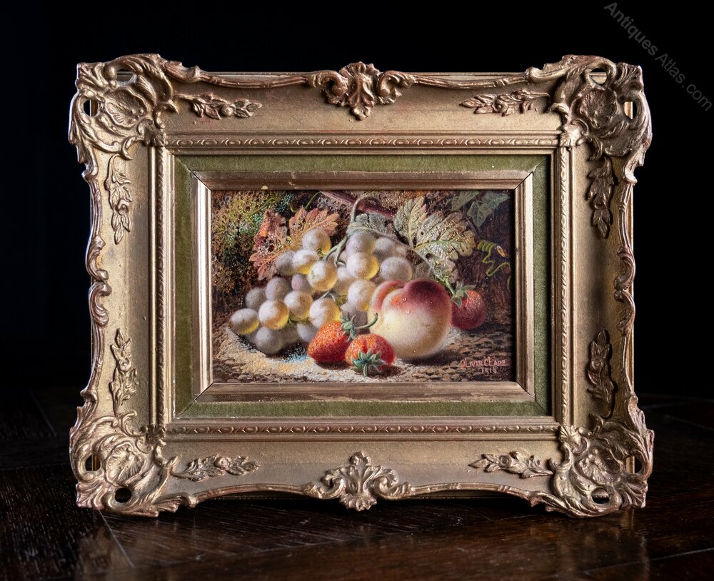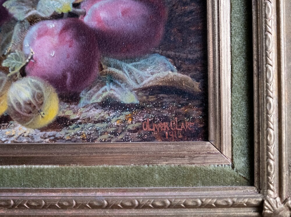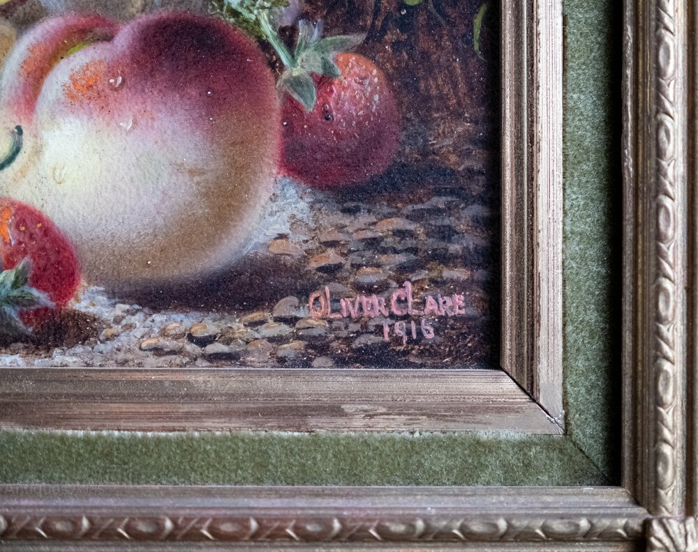 A truly outstanding pair of still life oils depicting an abundance of fruits by the renowned still life painter, Oliver Clare (1853-1927), dated 1916.Oliver Clare was a British painter who is best known for his detailed and polished academic still lifes of fruit and flowers. Born near Birmingham, England in 1853, Clare was the son of prominent still-life artist George Clare (1830-1890), who it is thought was responsible for much, if not all, of Clare's artistic training. Associated with the Artists of the West Midlands, the younger Clare exhibited paintings at the Royal Society of Artists in Birmingham, the Walker Art Gallery in Liverpool, and the Royal Society of British Artists in London.