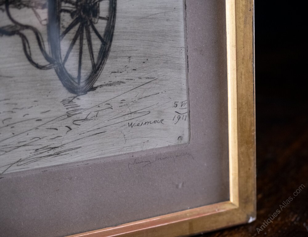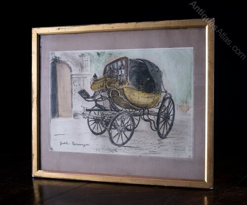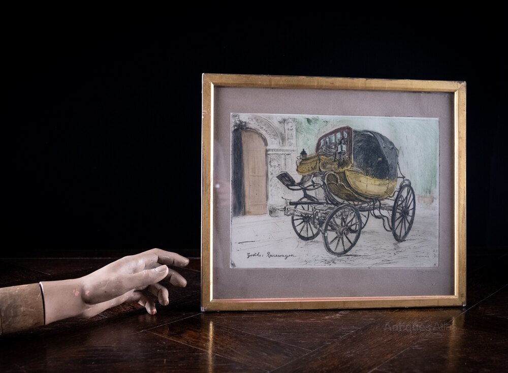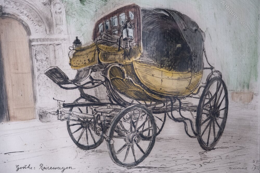 A hand-coloured etching of 'Goethe's Reisewagen' ('Goethe's Travelling Carriage'), dated 1911. Signed beneath the plate.Johann Wolfgang von Goethe's (1749-1832) reisewagen was a horse-drawn carriage known as the 'Batarde'. He famously used it for his journeys, notably his "Italian Journey". The 'Batarde' is now preserved at the Goethe National Museum in Weimar.