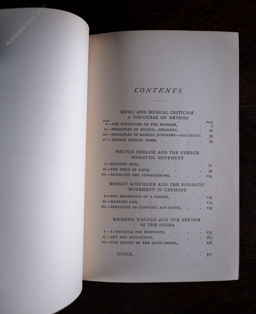 'Studies In Modern Music' by W. H. Hadow. Published by Seeley and Co Ltd, London, 1898.Relfe Brothers, London full tan leather prize binding. Binder stamp to front flyleaf. Central Foundation Boys' School, London crest gilt stamped to the front board. Five raised bands to the spine and gilt stamped title panel. Light shelf wear and very slight fading to the boards in areas but generally the volume exterior remains in a very good condition overall.