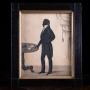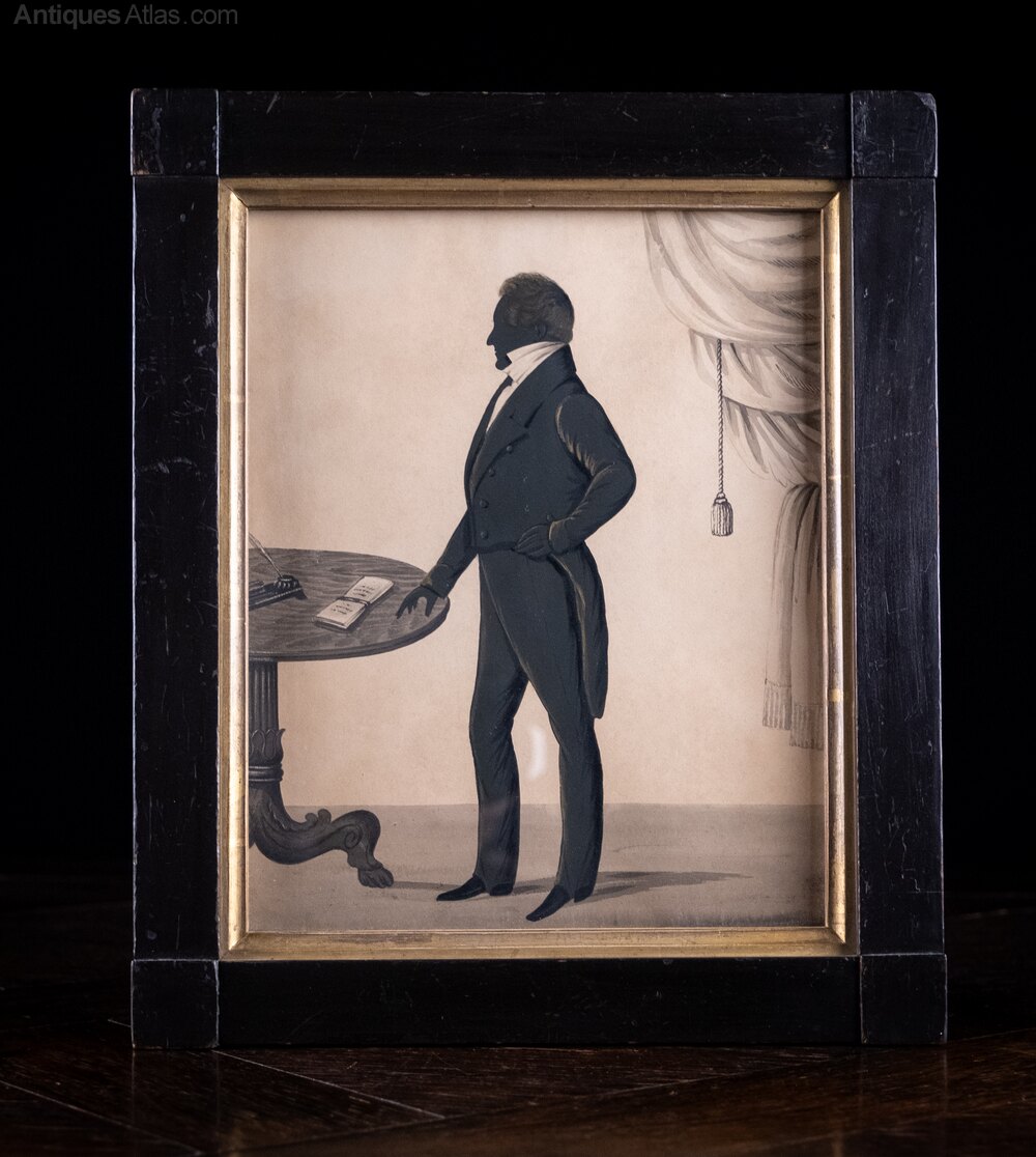 A delightful early 19th century full-length gilded silhouette portrait of a gentleman of good proportions. Unsigned.The portrait depicts the unidentified gentleman standing at a centre table with fingers resting upon the same before a bound document with heavy drapery to the background. The work is finely depicted throughout.