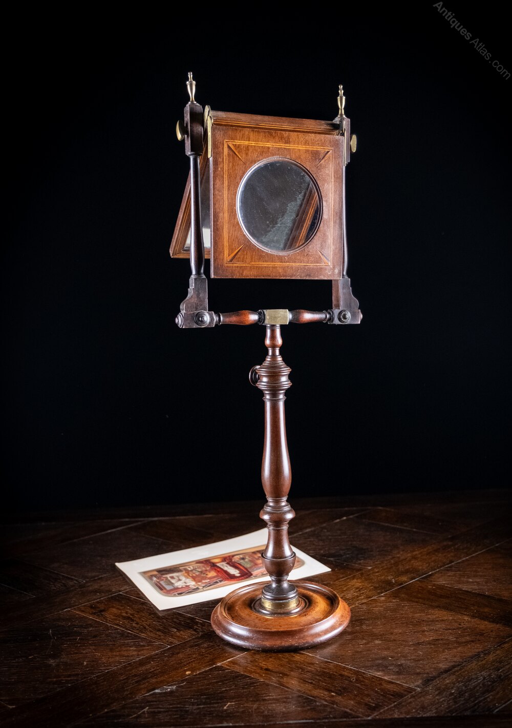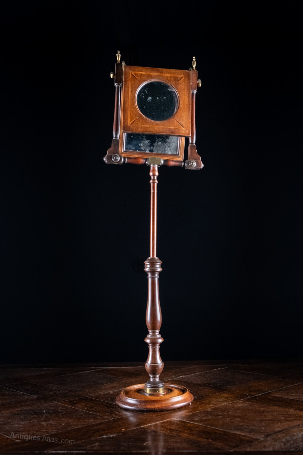 This example has a turned wooden base below a brass band, an extendable stem, inlaid viewing magnifier, original adjustable mirror plate and brass urn finials. The original mirror plate has some foxing but remains fully useable for viewing. There looks to be a sympathetic historic repair to the top of the stem above the which remains strong.