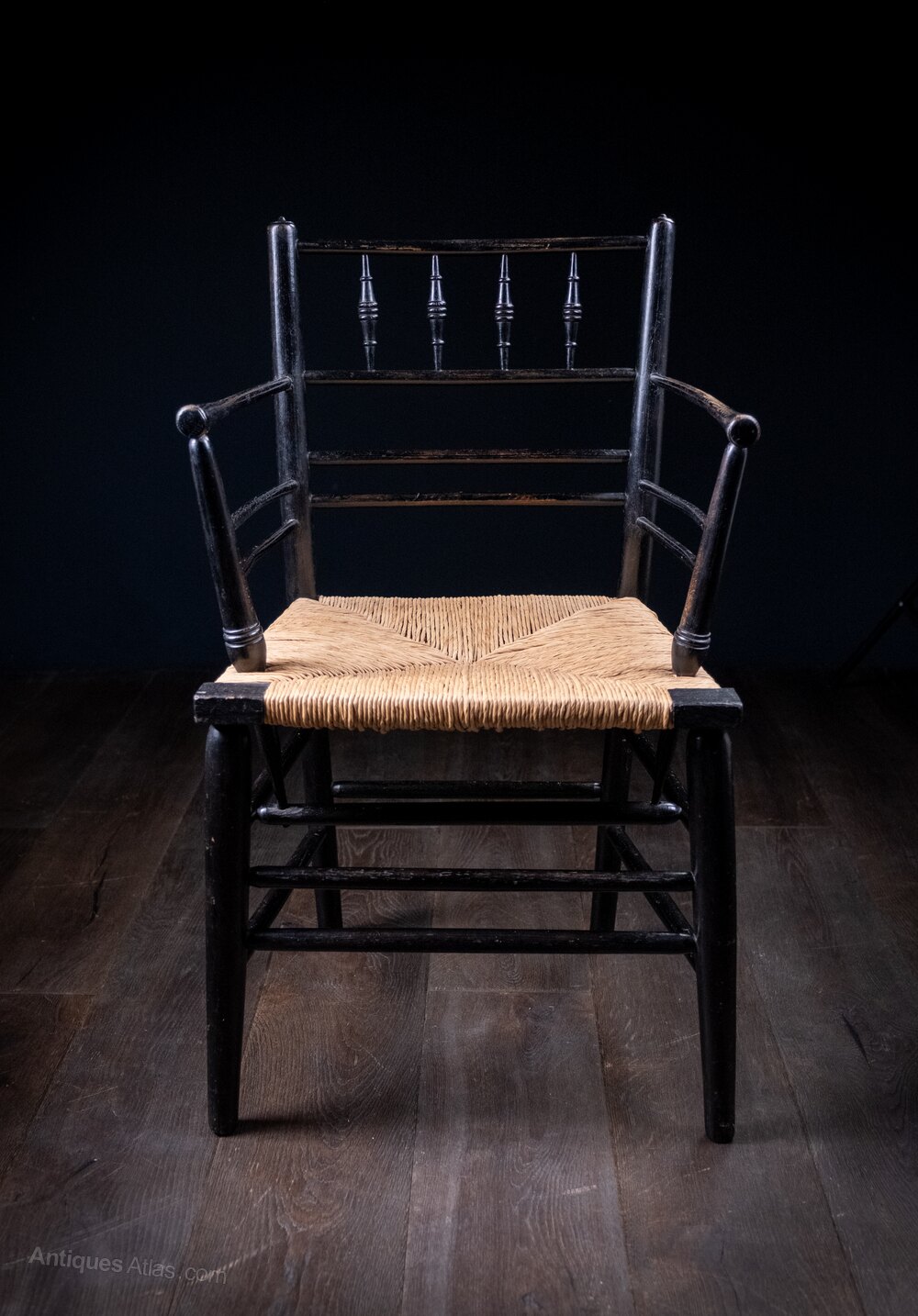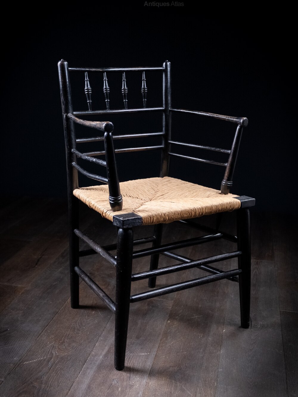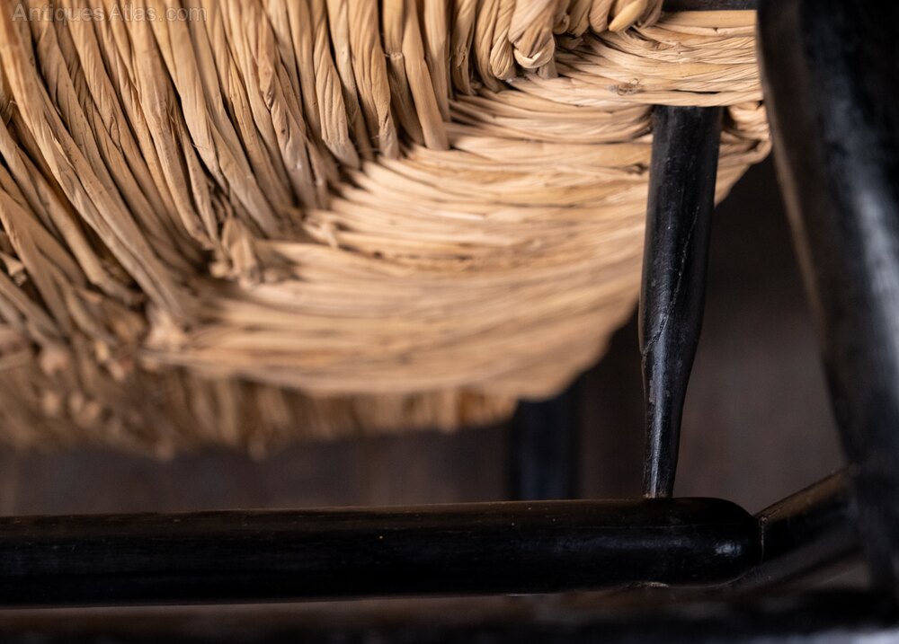 A fine 19th century Morris & Co Sussex chair, c.1870. Designed by Ford William Maddox for William Morris.Charming areas of wear to the arm rest from years of use. There is evidence of repair and restoration in areas. The rush seat is later and in excellent order. There have been historic repairs to the supporting seat pegs, and a few stretchers ends are ever so slightly out of their hole (please see photographs). There is a slight movement in the joints but the chair overall is in a good strong usable condition.