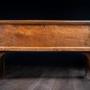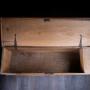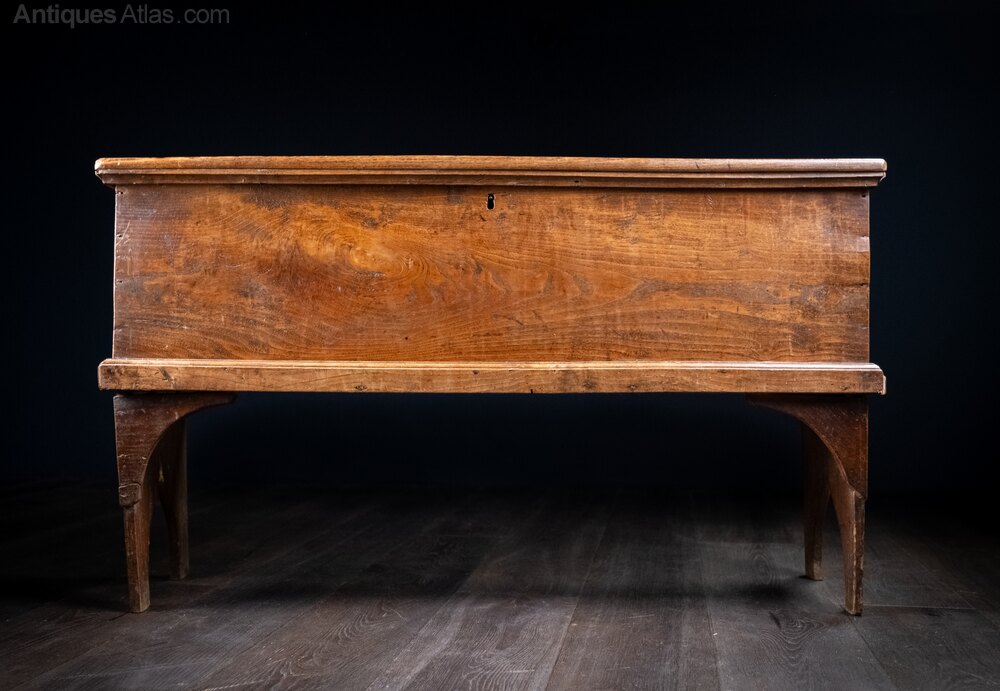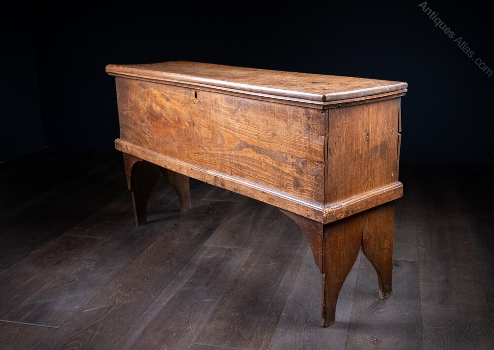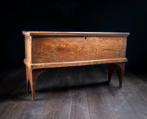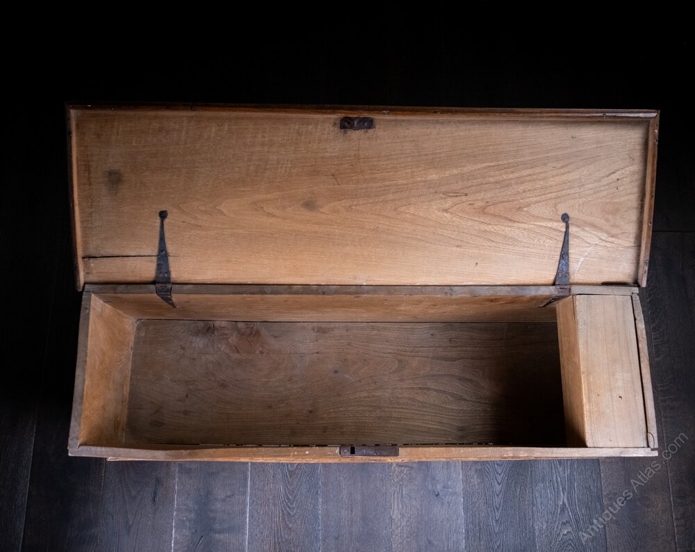 A late 17th century elm coffer of wonderfully narrow proportions, raised upon two carved gothic arches. The lid opens to reveal original handmade iron hinges and candle box.There are some marks to the top and evidence of historic woodworm (which has been treated in abundance of caution). There is a small historic loss to the left corner moulding, which appears to be subsequent to the historic woodworm. The area is stable and all other areas remain firm and sturdy.