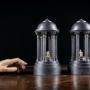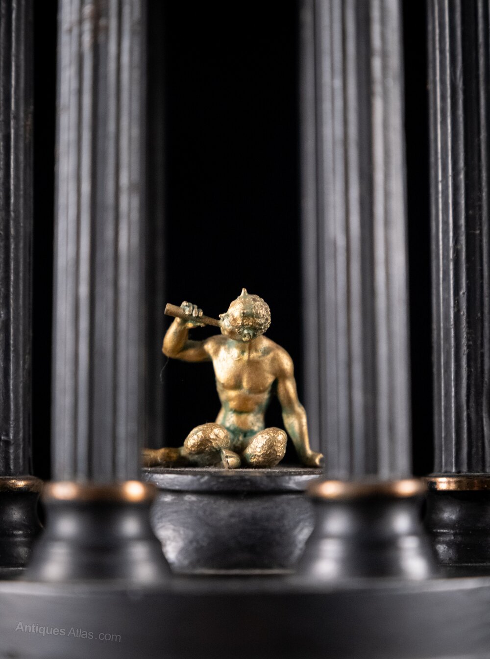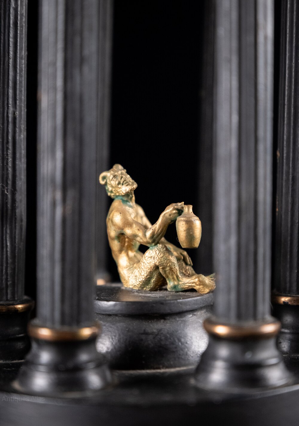 A stunning large pair of Grand Tour slate temple models with gilt bronze figures of Bacchus and Pan housed within, c.1880.Each model boasts a domed top above six reeded pillars with gilt detailing above a stepped base. The small gilt bronze figures of Bacchus and Pan within each temple are very crisply cast and boast impressive detail.