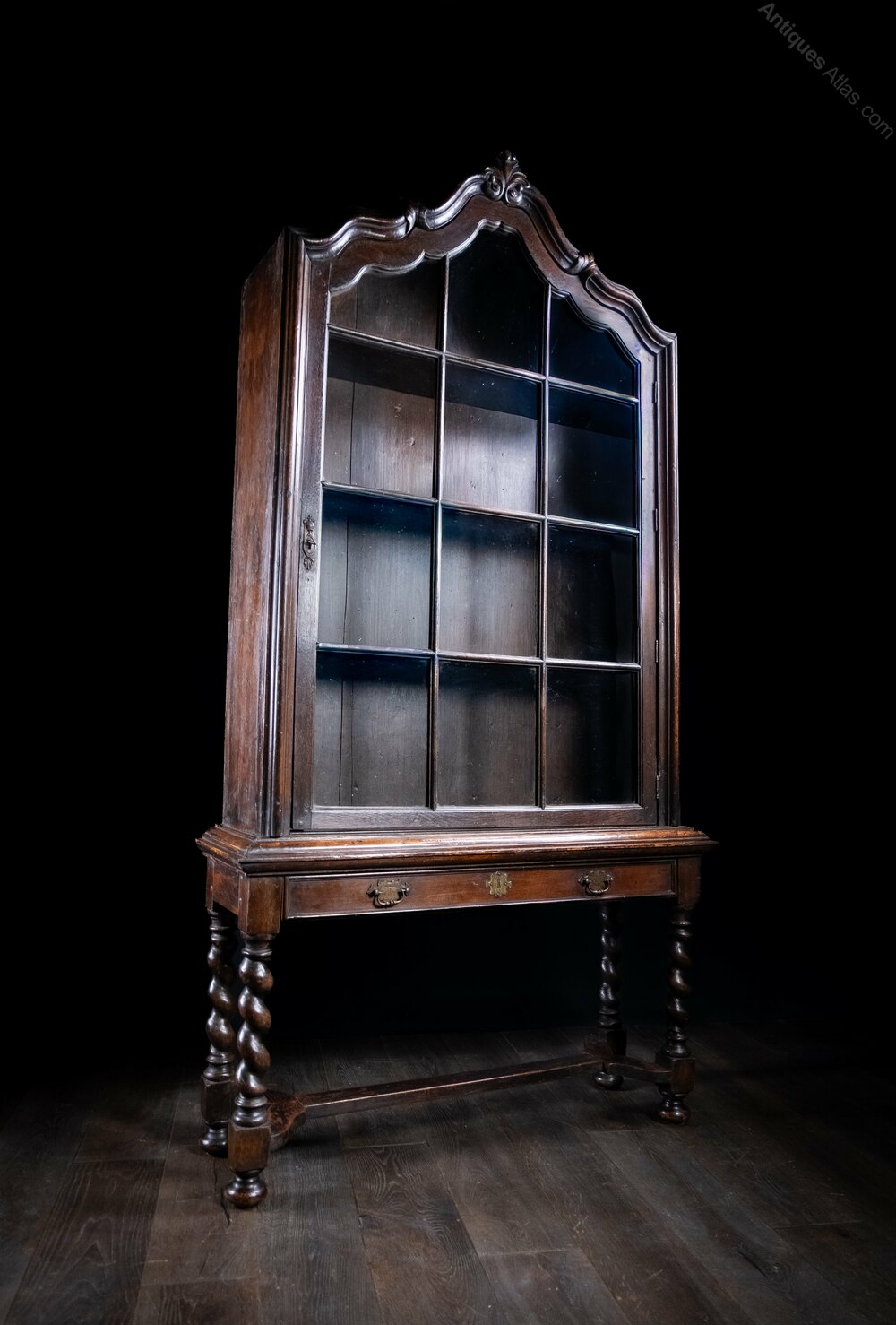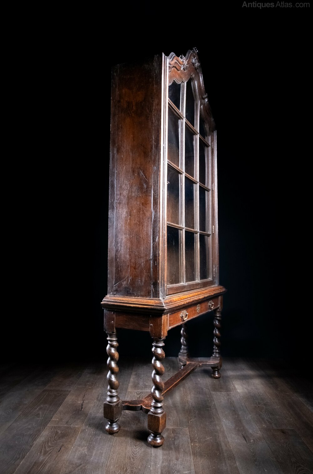 A superb William & Mary period oak glazed bookcase on stand of unusually narrow proportions, c.1680. Probably Scottish in origin.The moulded arched cornice is centred with a shell motif above a large single glazed door opening to a shelved interior, all upon an oak base with a long frieze drawer raised upon thick barley twist legs, the whole joined by a cross stretcher. Working lock and key.