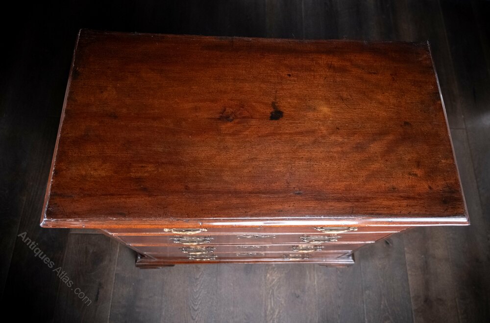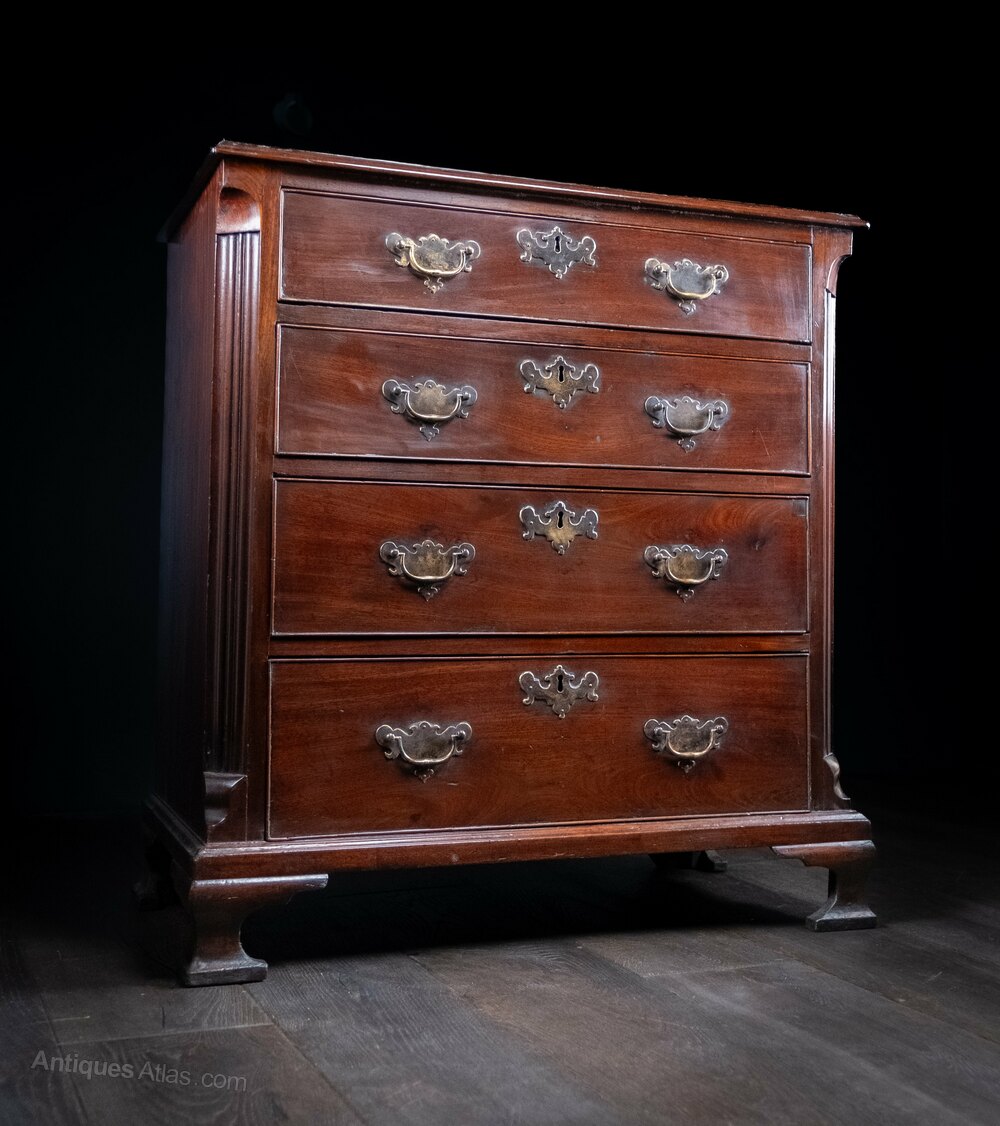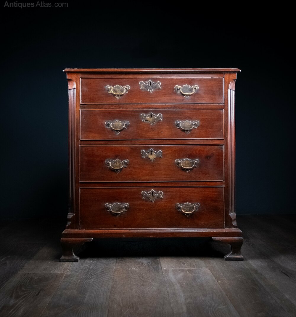A superb George III period mahogany chest of drawers of diminutive proportions and glowing colour.The rectangular moulded top is raised upon four long graduating drawers with brass handles and escutcheons, flanked by reeded corners, the whole raised upon four ogee feet.