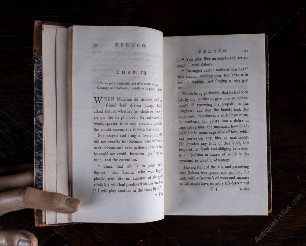 'Zeluco - Various View Of Human Nature, Taken From Life And Manners Foreign and Domestic' by John Moore, 1789 first edition thus.Both volumes are three quarter bound in a tan leather with gilt-stamped title and five raised bands to the spine. Marbled boards. Both volumes have shelf wear to the extremities. Volume I has wear to the title panel. The binding of Volume II is a little weak but does remain bound.