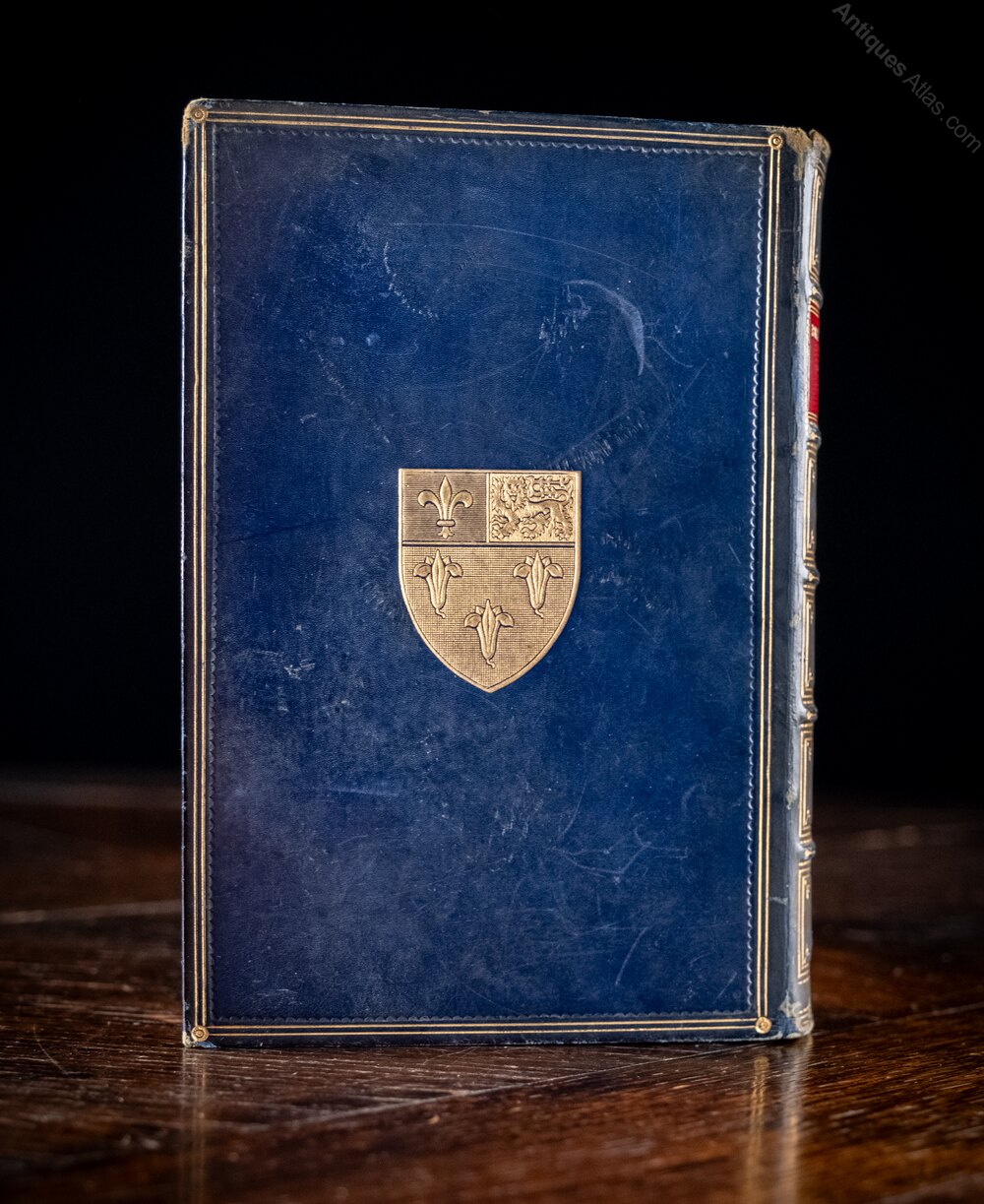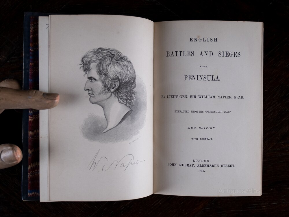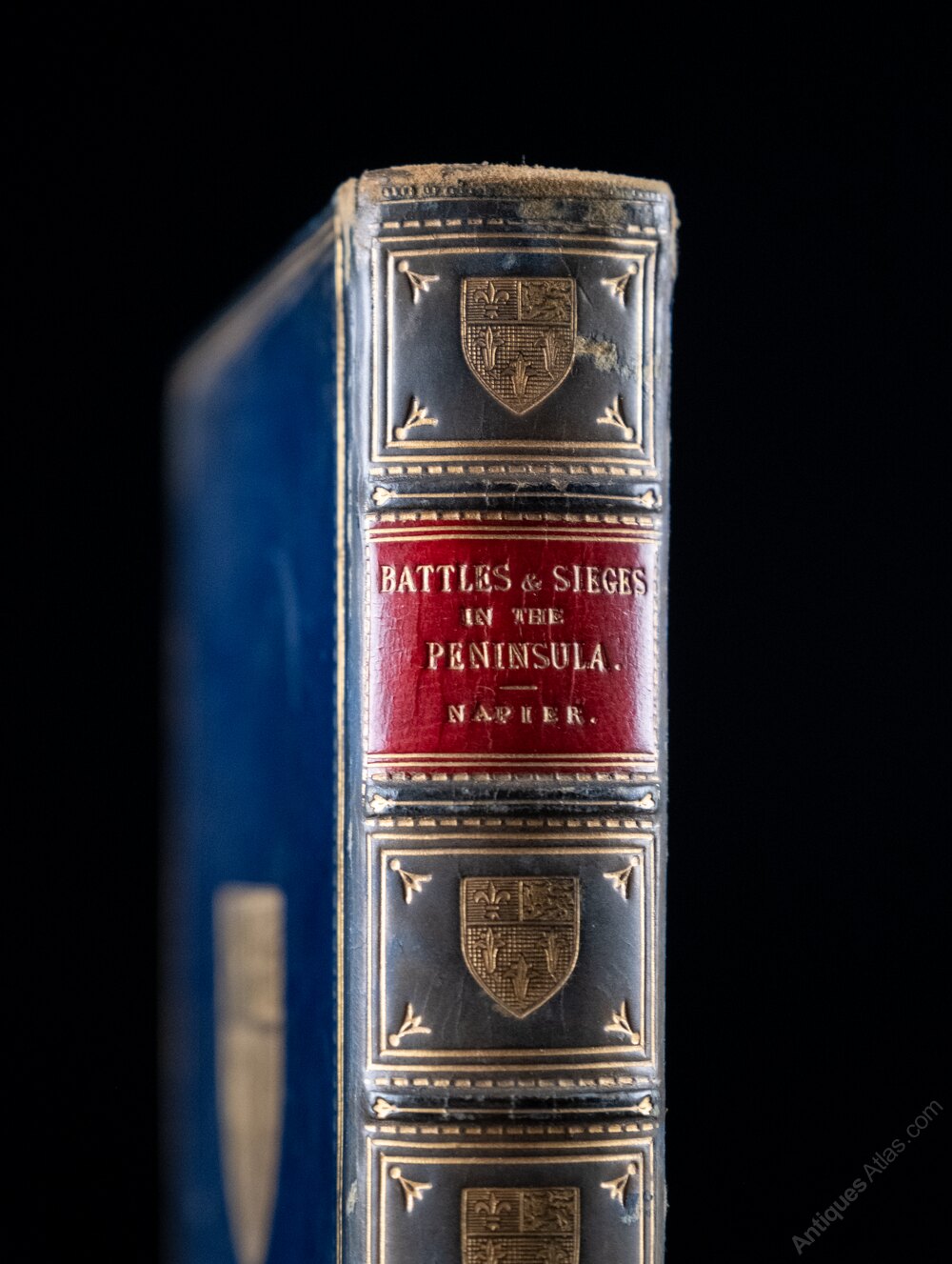 'English Battles & Sieges In The Peninsula' by Sir William Napier. Published by John Murray, London in 1885.Handsomely bound in an Eton School binding full royal blue leather, five raised bands to the spine with gilt stamped Eton crest to both boards and spine. Red leather title panel. There is some light scuffing to the boards in areas but generally the boards remains in a good attractive condition. Binding remains tight.