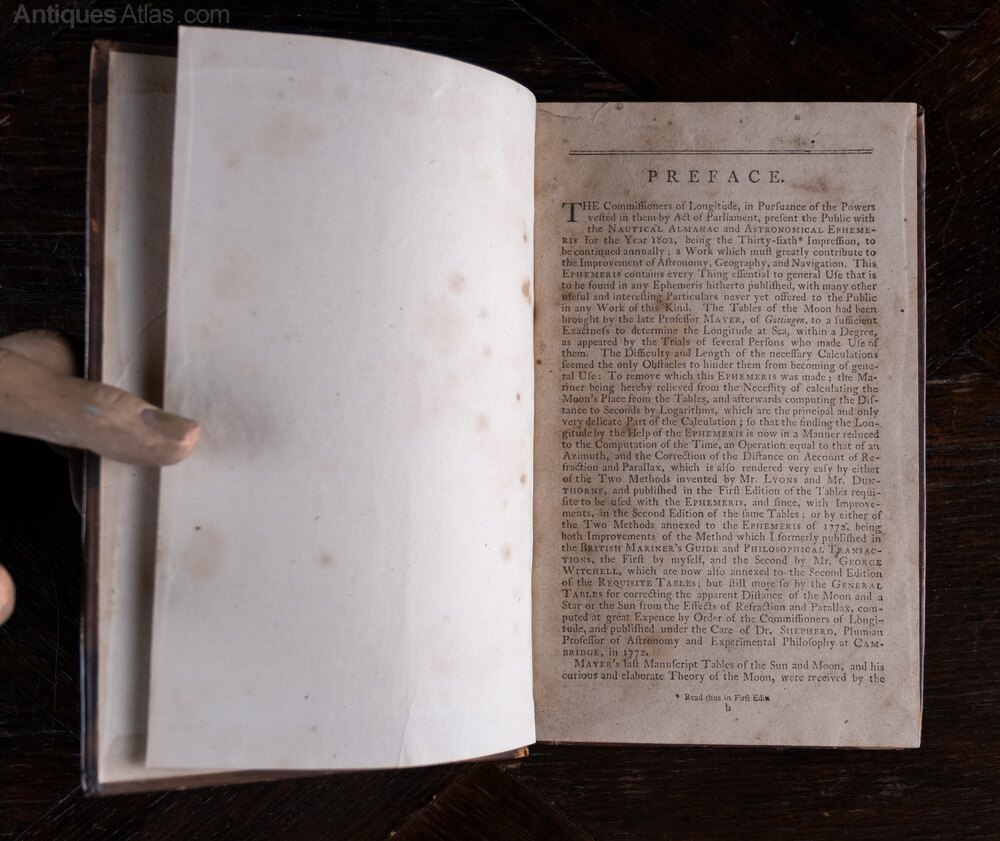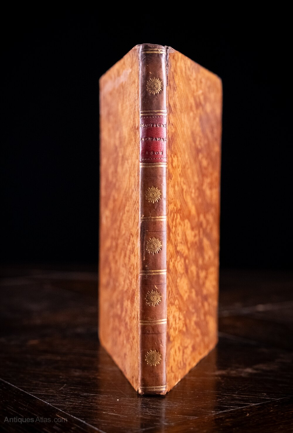 'Nautical Almanac and Astronomical Ephemeris For The Year 1802', published by the Commissioners of Longitude, printed by C. Buckton, London, c.1796. Thirty-sixth impression.Full leather binding. Blind-stamped decoration to both boards. Red leather title panel and gilt star decoration to spine. Title page and first four preliminary pages citing the extracts from the Act of Parliament concerning longitude are absent thus volume begins at 'Preface'. There is some spotting to the preliminary pages and some browning but generally all pages are in good condition. Wholly readable, free from inscription and tears.