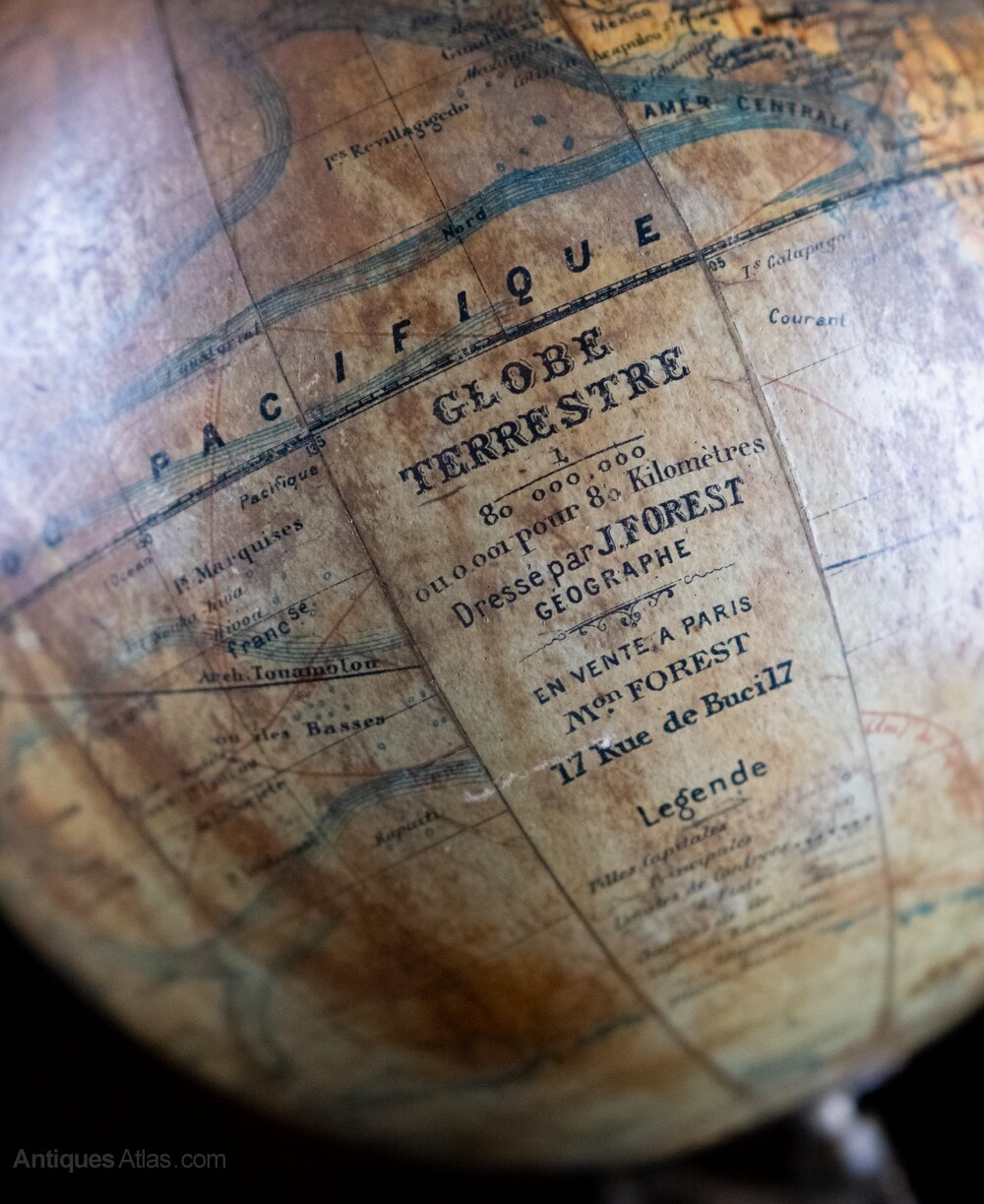 A French 'Globe Terrestre' by the renowned 19th century geographer and map publisher J. Forest of Paris. Scale 1/80,000,000.In addition to land masses and their borders, the chromolithographed gores show the oceans with their currents, with steamship routes in red with ports of arrival and departure. The globe is mounted on its original ebonised stand with brass acorn finial.