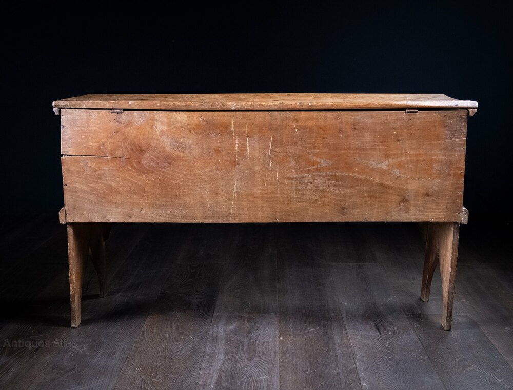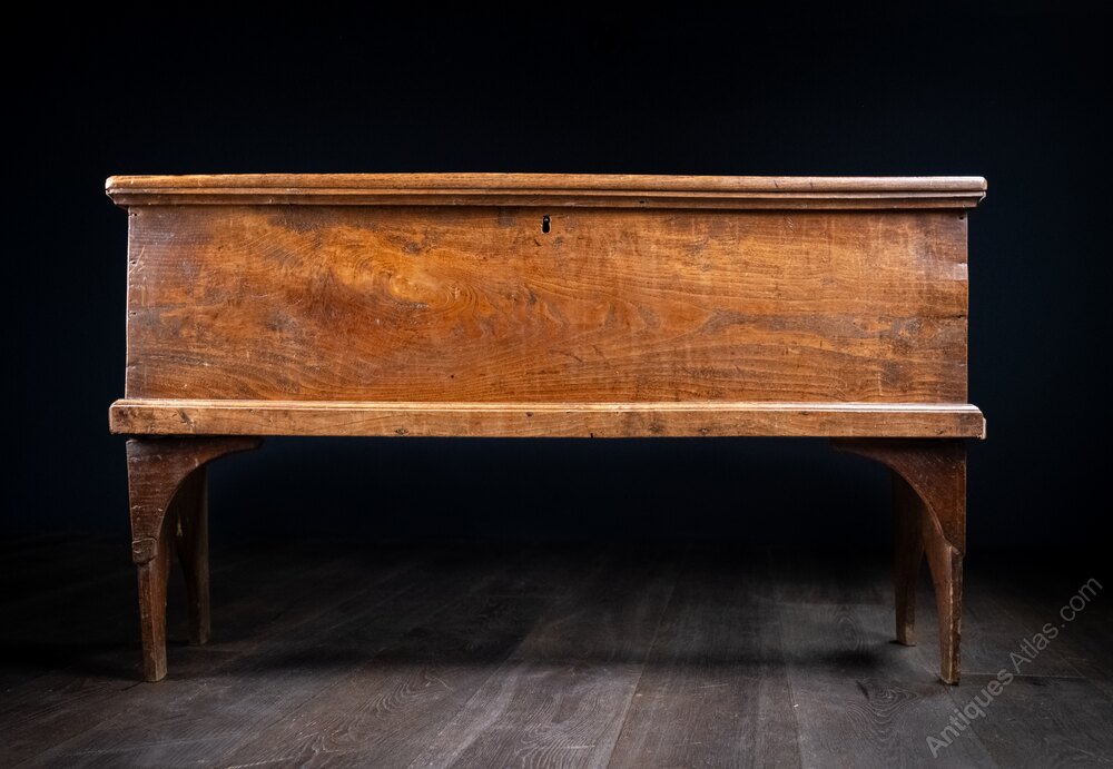 A late 17th century elm coffer of wonderfully narrow proportions, raised upon two carved gothic arches. The lid opens to reveal original handmade iron hinges and candle box.There are some marks to the top and evidence of historic woodworm (which has been treated in abundance of caution). There is a small historic loss to the left corner moulding, which appears to be subsequent to the historic woodworm. The area is stable and all other areas remain firm and sturdy.