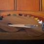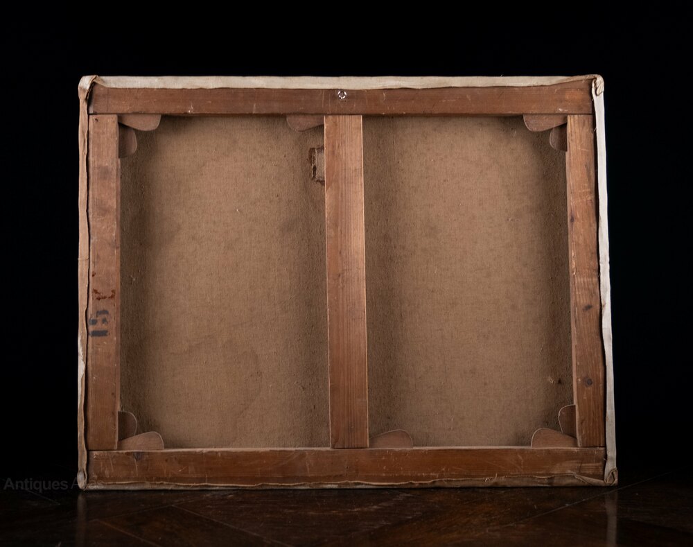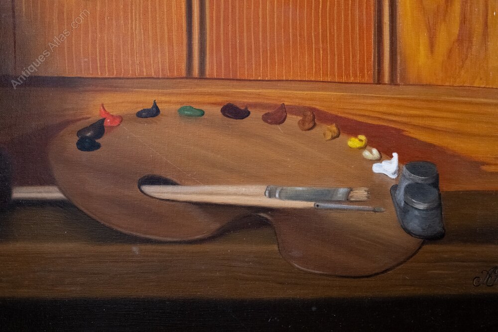 A fantastic early 20th century vanitas still life, French School, c.1930s. Signed 'A. Fremont' to the lower right. Unframed.A vanitas paining symbolises the transience of life, the futility of worldly pleasures and the inevitability of death. This work depicts a skull atop a book with an artist's palette and paintbrushes, with a depiction of a red chalk drawing pinned to the pine boards above the scene. The work is well painted with fantastic use of shadow to create an effective three dimensional illusion. There is a small hole to the canvas to the left of the book. Verso there is evidence of a historic repair (please see photographs).