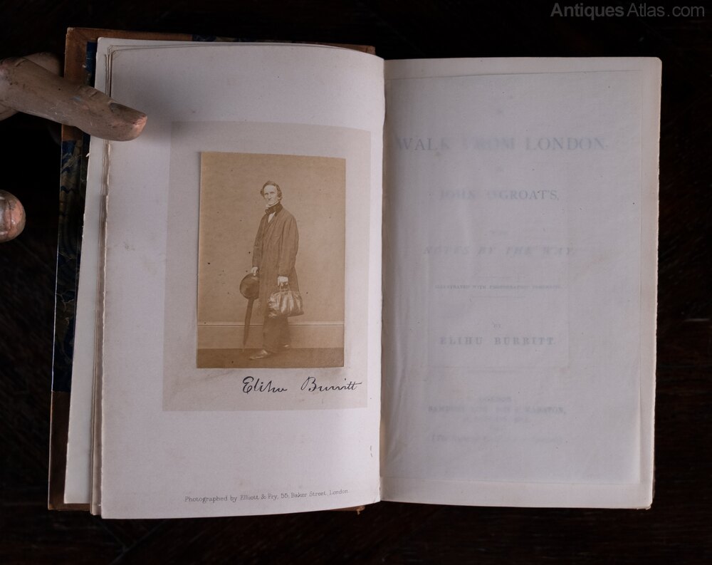'A Walk From London To John O'Groats, With Notes By The Way' by Elihu Burritt, published by Sampson Low, Son and & Marston, London in 1864. Illustrated with photographic portraits.Three-quarter bound in a tan leather with five raised bands, red leather title panel and black leather author panel to the spine. Marbled boards. The red leather title panel appears historically re-affixed with some looseness to the edges (please see photographs). There is some shelf wear to the extremities.
