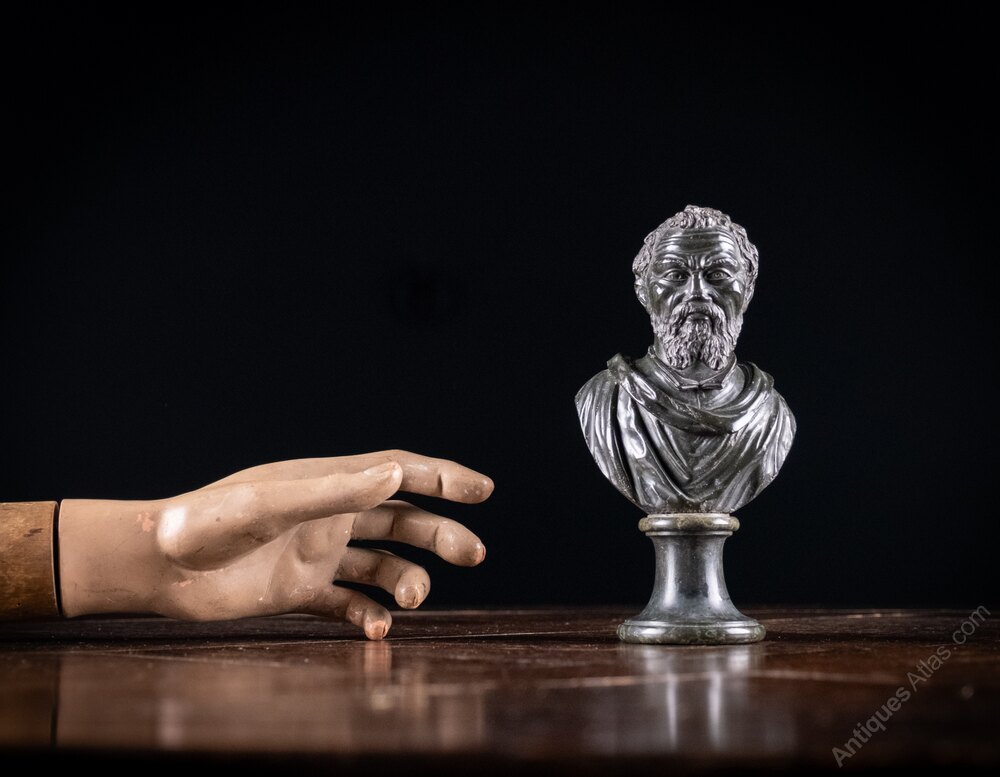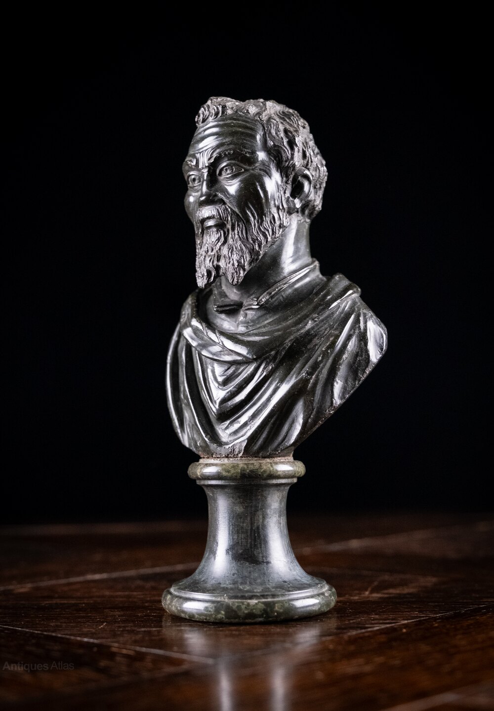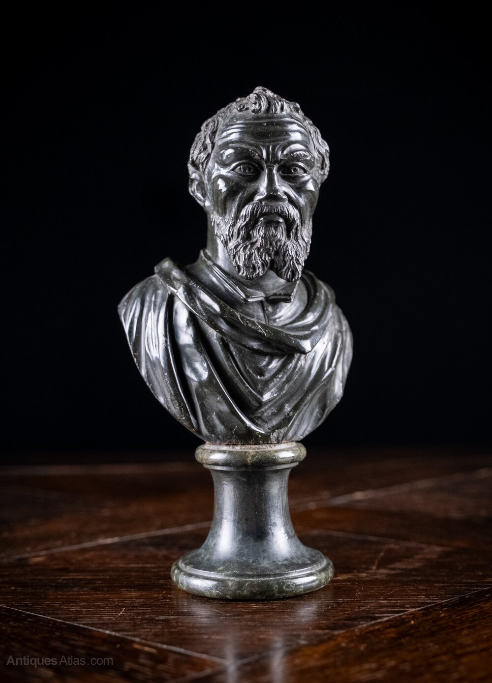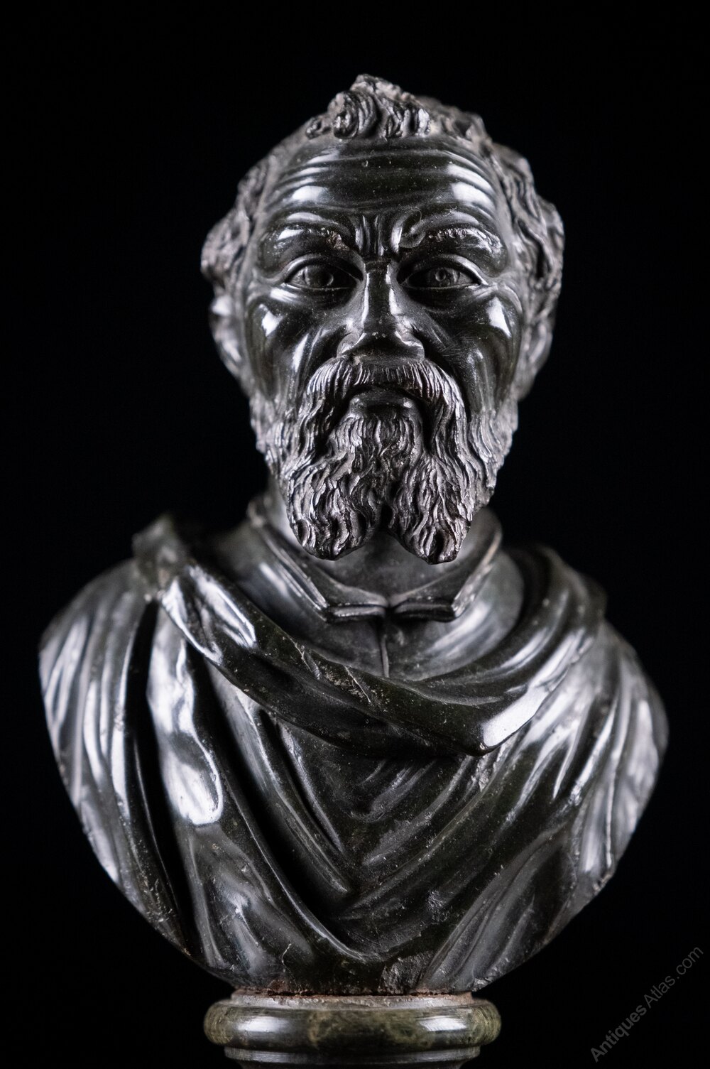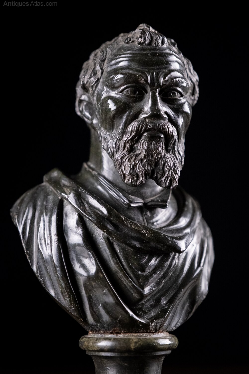 A 19th century Grand Tour serpentine bust of Michelangelo (1475 - 1564).The serpentine bust sits atop a serpentine socle base. There looks to be a historic reattachment of the bust to the base but the whole is secure without movement.