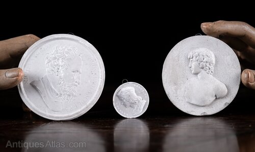A set of three Grand Tour plaster portrait intaglios.Two of the intaglios are clearly identifiable as Michelangelo and Raphael, the last is untitled. All three have hanging hooks in place ready for display.