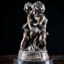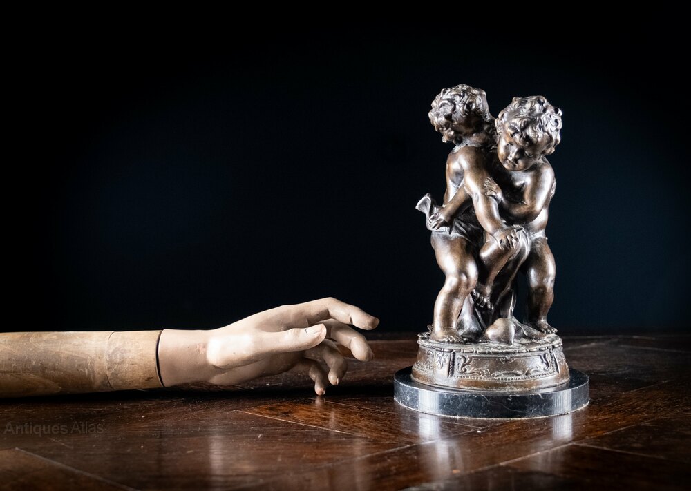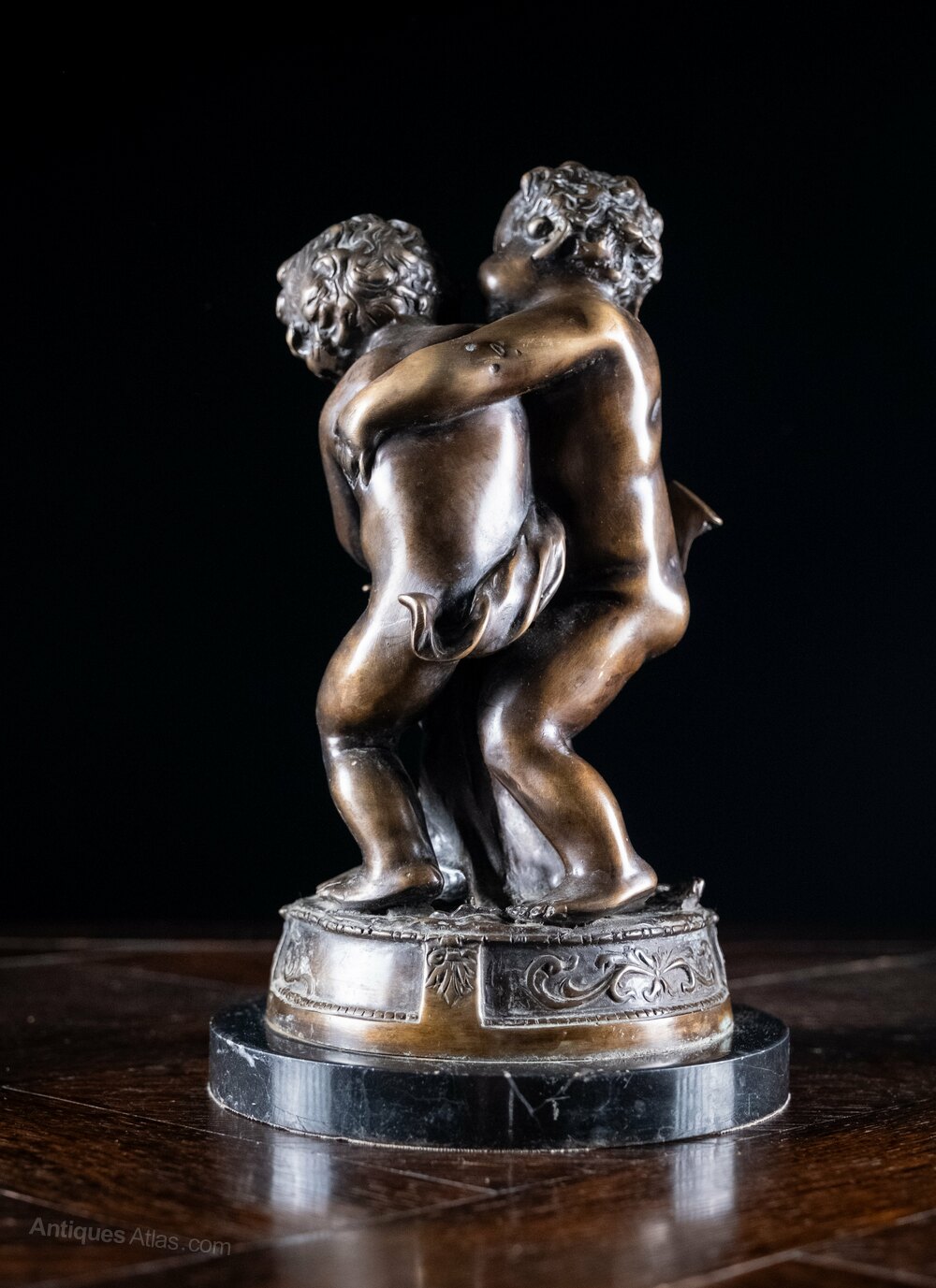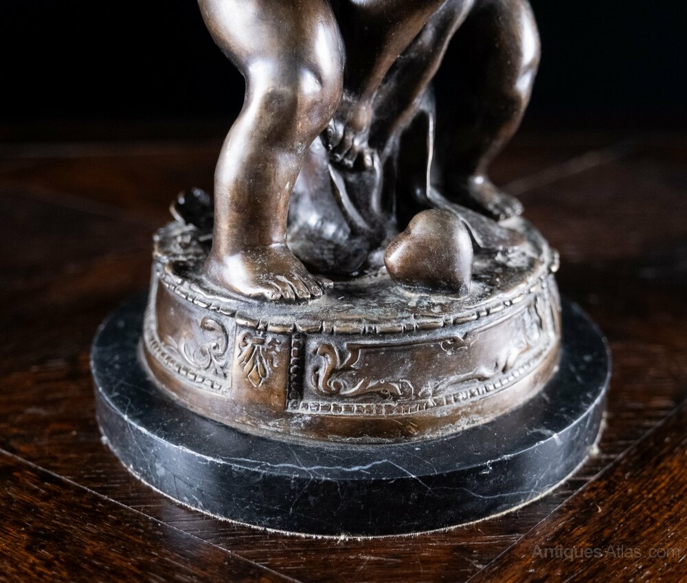An outstanding substantial 19th century bronze after Jean Baptiste Pigalle (1714–1785) Eros and Anteros fighting over a human heart, the whole upon a black marble base. The bronze is of good proportions at 52cm (20 inches) high.The sculpture illustrates the contrasting but complementary nature of love, with Eros representing love and Anteros representing love returned or 'reciprocal love' in a passionate struggle over a human heart. According to Greek mythology, Anteros was conceived as a companion to Eros, both sons of Aphrodite and Ares. Their relationship represented the contrast between friendship and rivalry and devotion and conflict and as such they were often depicted wrestling or fighting in some sort of competition.