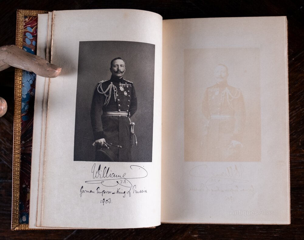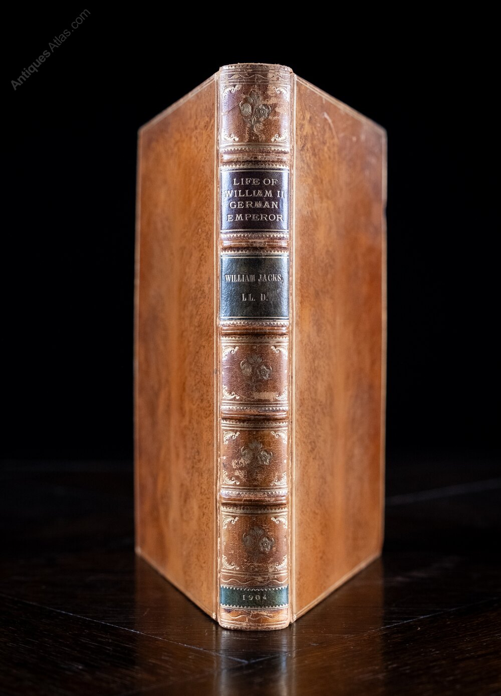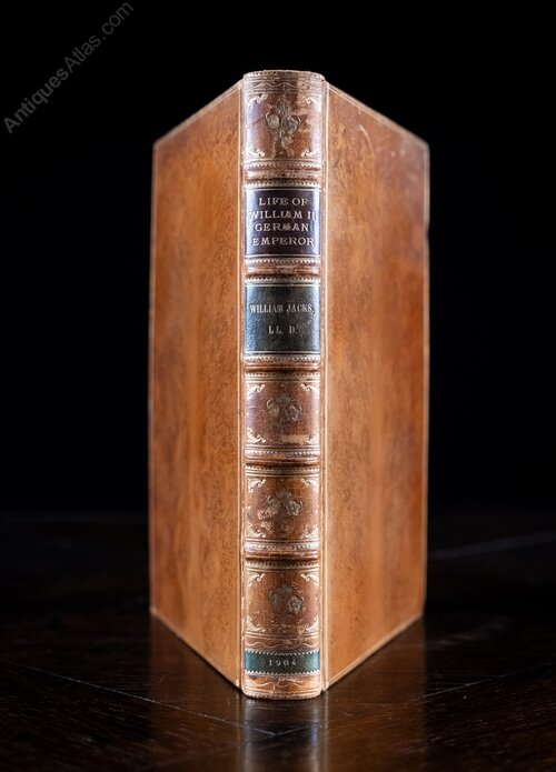 'The Life Of His Majesty William The Second German Emperor' by William Jacks, published by James MacLehose and Sons, 1904.Fully bound in a tree calf binding with five raised bands to the spine, deep brown leather title panel and green leather author and date panels. The boards remain firmly affixed and the whole exterior remains in a very good condition throughout.