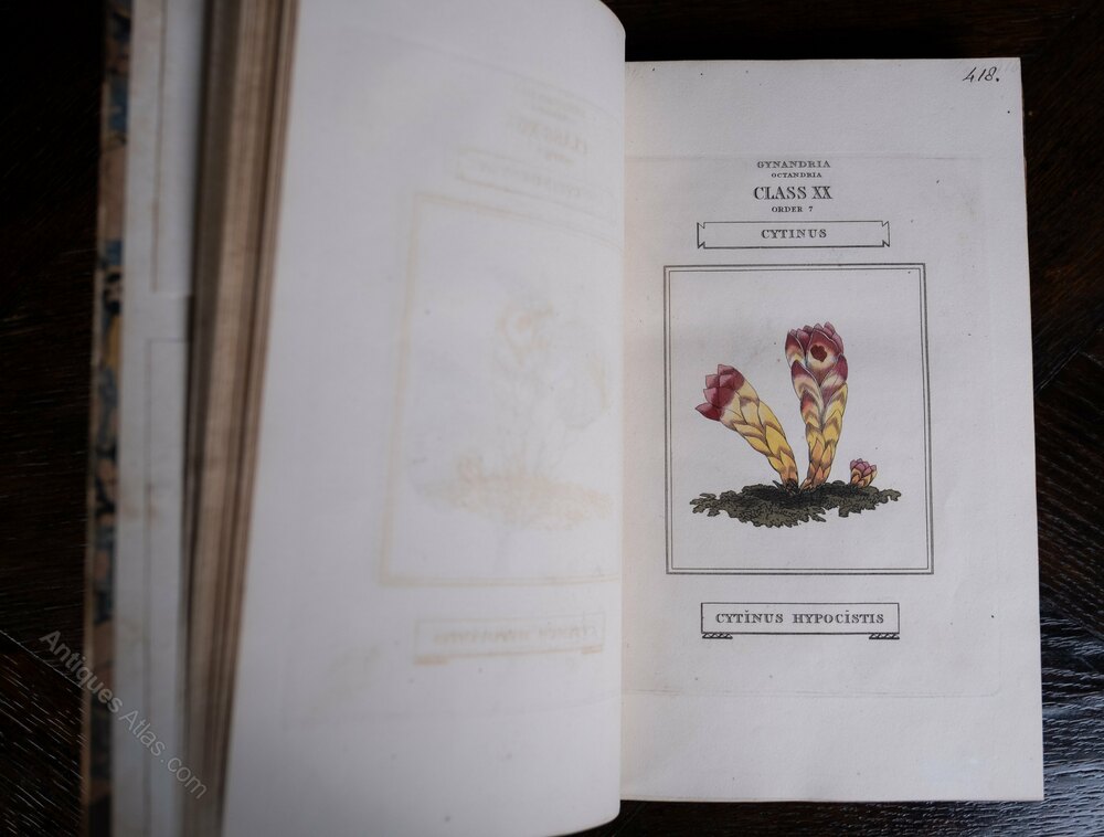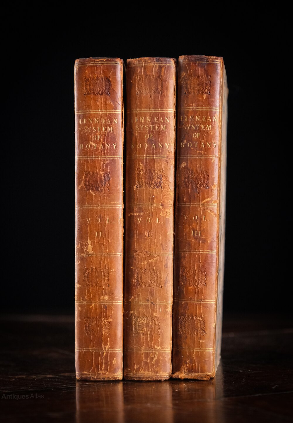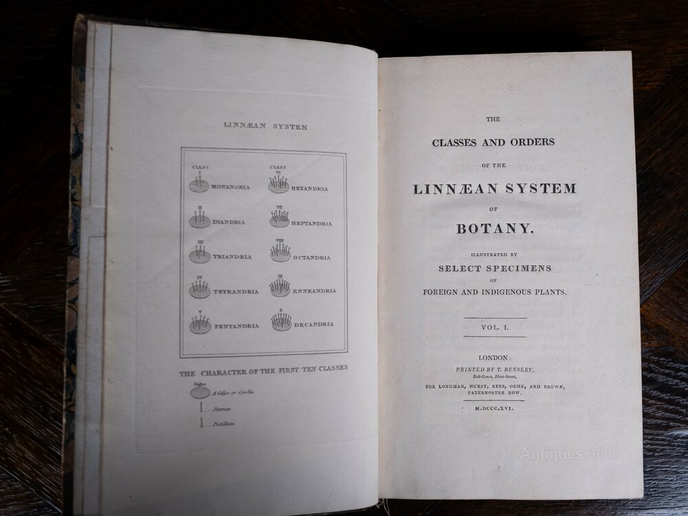 'The Class And Orders Of The Linnaean System Of Botany' by Richard Duppa, published by Longman, Hurst, Rees, Orme and Brown, London in 1816. First edition thus. Complete in three volumes. With 240 engraved plates, 237 of which were hand coloured.This scarce set is three-quarter bound in tan calf leather with marbled boards and gilt stamped title and banding to the spines. All volumes show signs of shelf wear but the boards remain firmly affixed and the bindings tight.