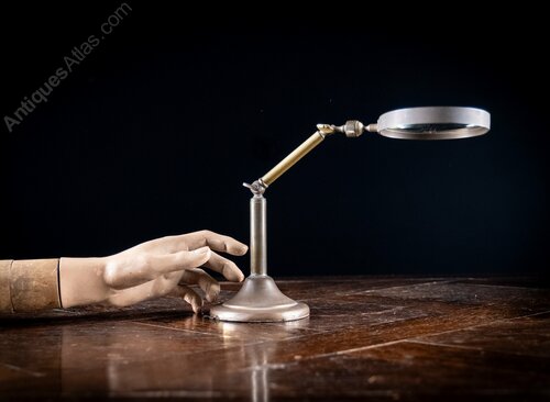 The angle-poise has various knocks and repairs from its years of use. The stem has been historically re-soldered to the base and the leather underside of the base is fraying to the extremities. The magnifier lens ball joint is seized. The adjustable stem and keys work as they should. The lens itself remains in a very good condition.