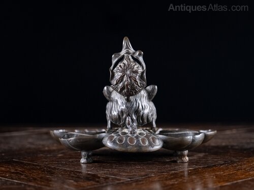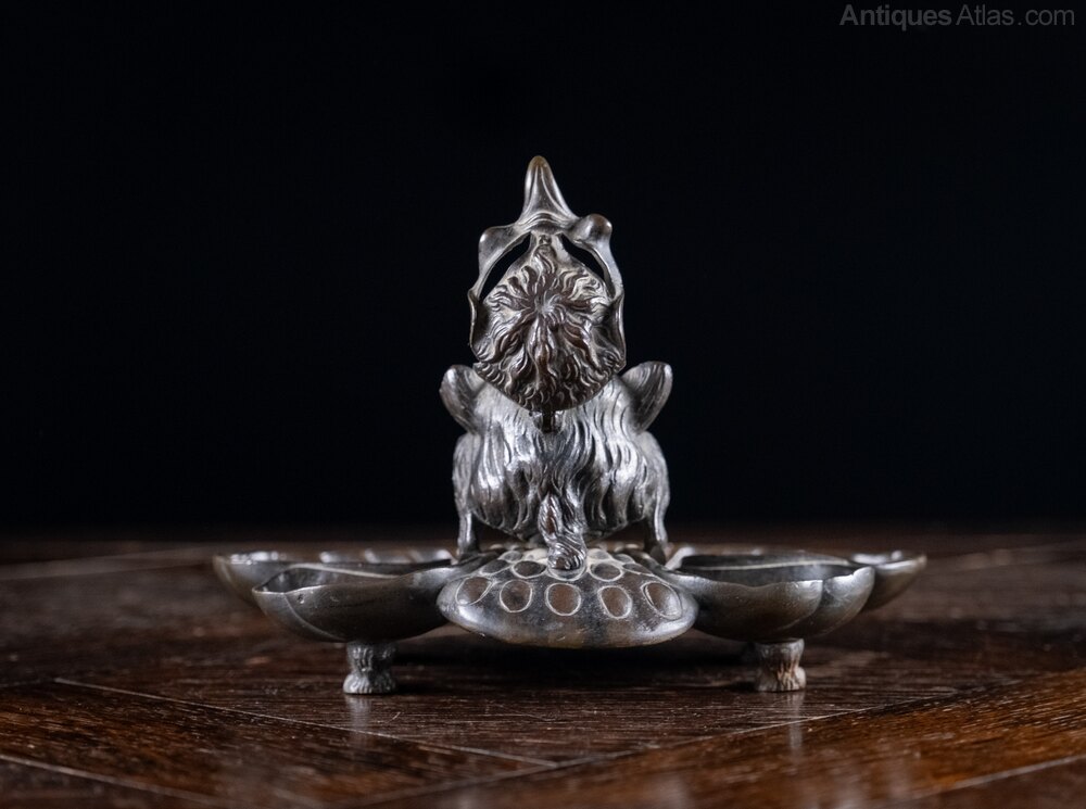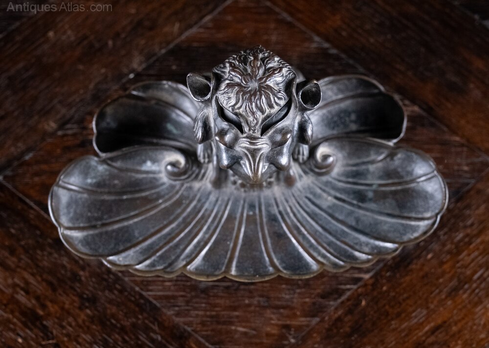 An intriguing and substantial late 19th century bronze devil inkwell.The devil is perched upon the back the bronze pen rest, with its hollow ears functioning as pen holders. The devil is concealed from above by a bird mask lid which reveals the devil beneath when lifted. Although the devil will be apparent to whomever opens the lid, he is then cleverly disguised as a bird when viewed from the back, with the devil's hind legs becoming the bird's feet and its ears the wings. The whole is sat upon four thick bronze paw feet.