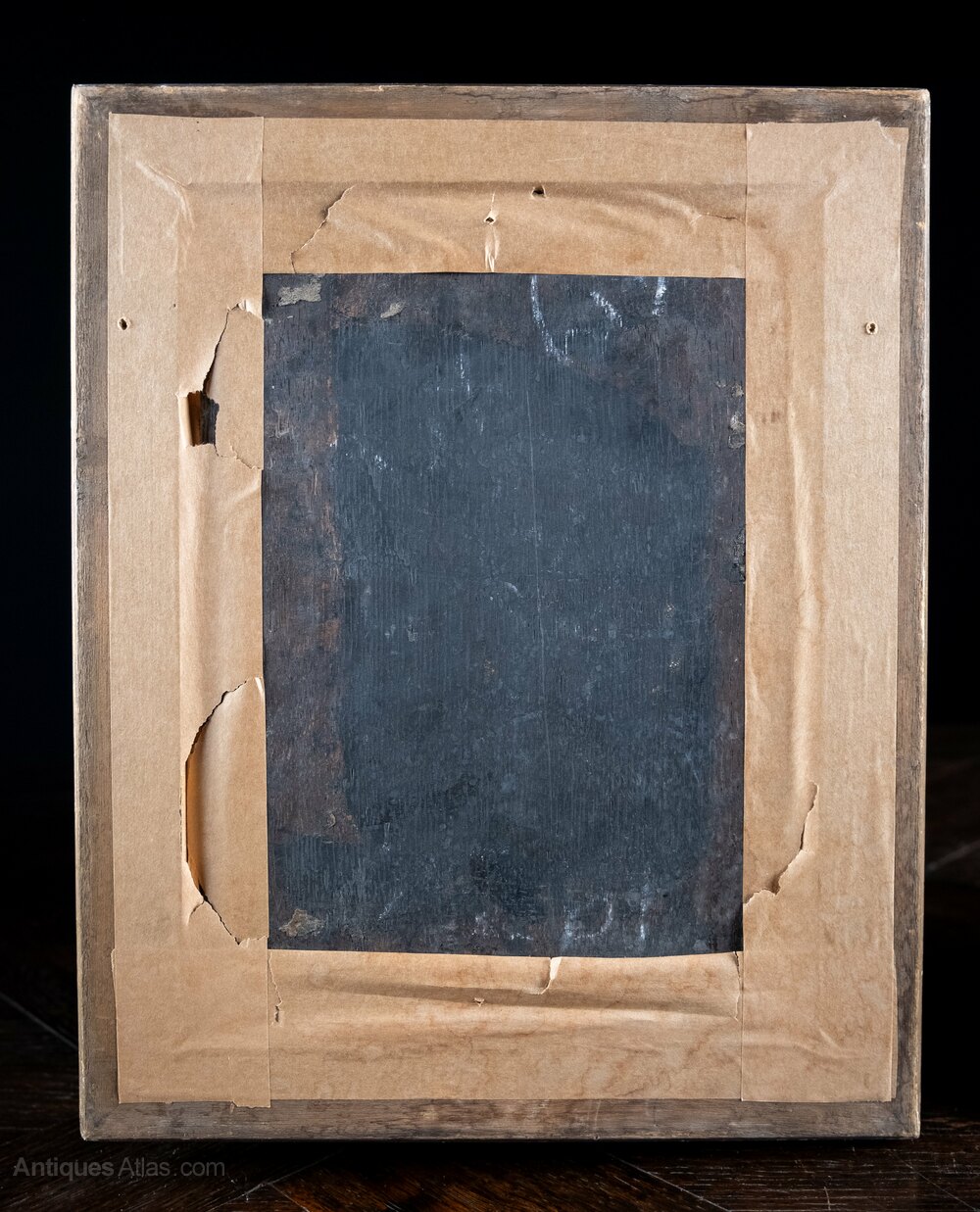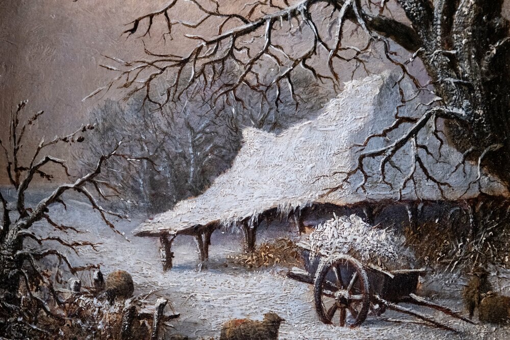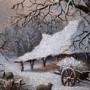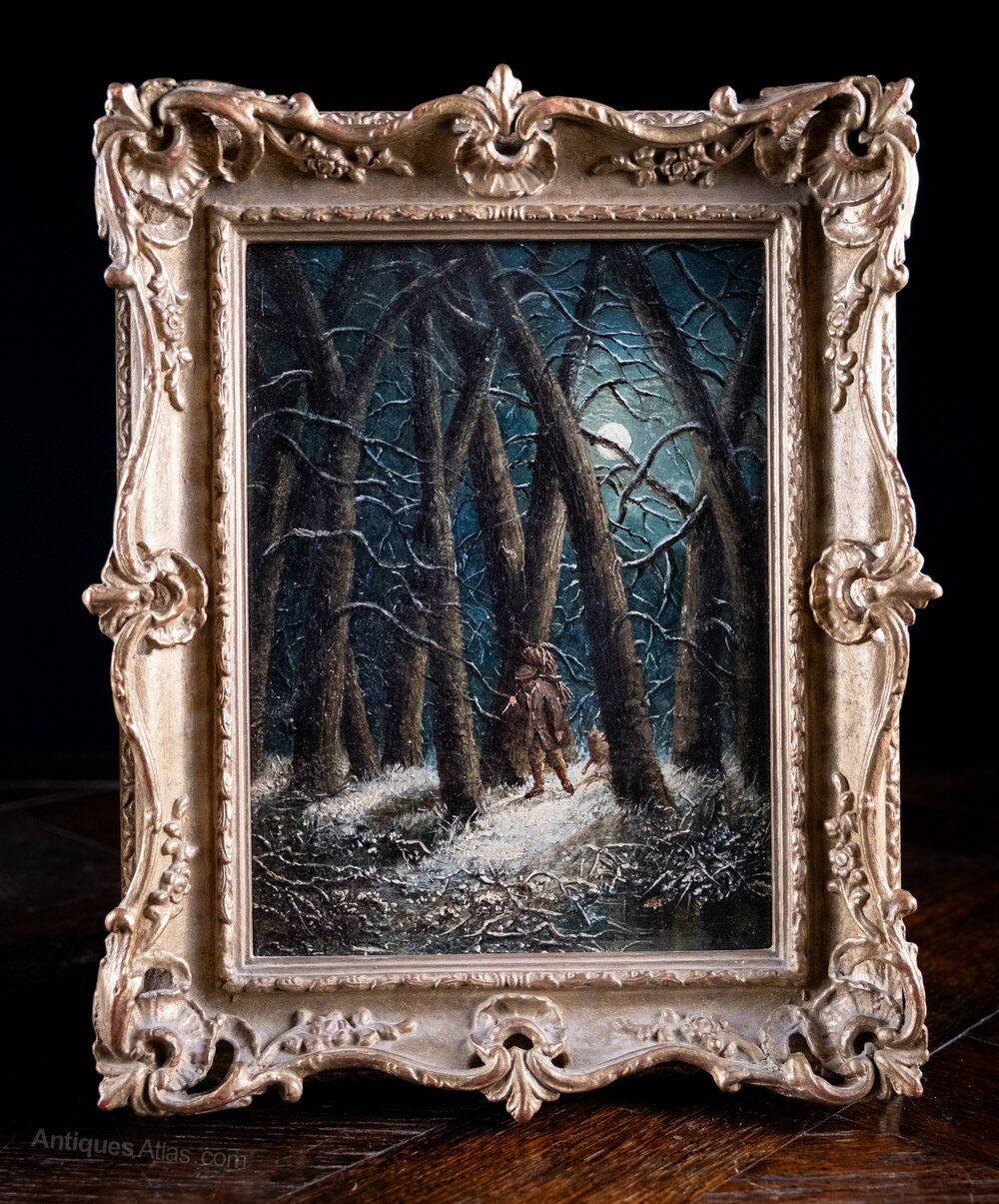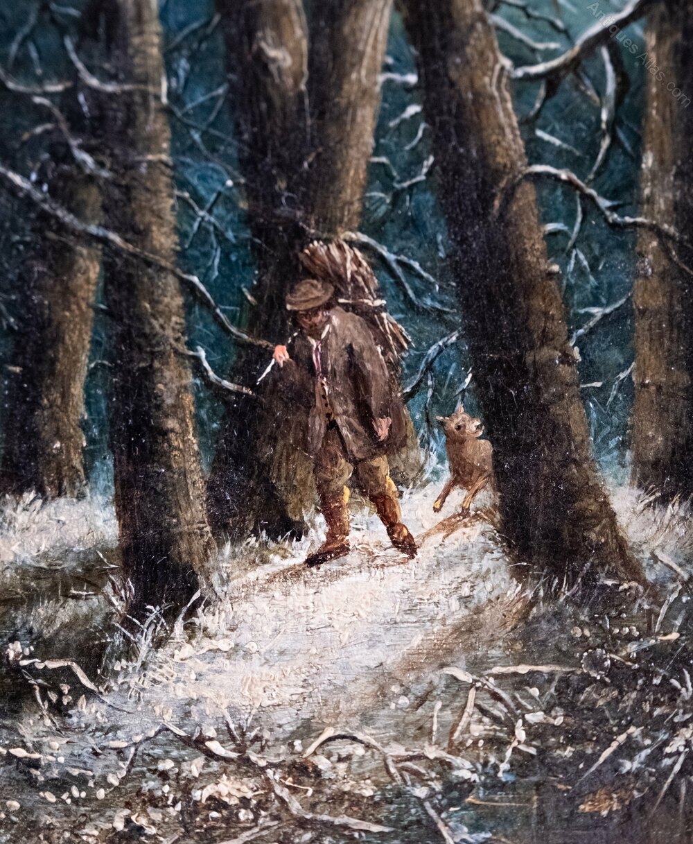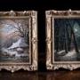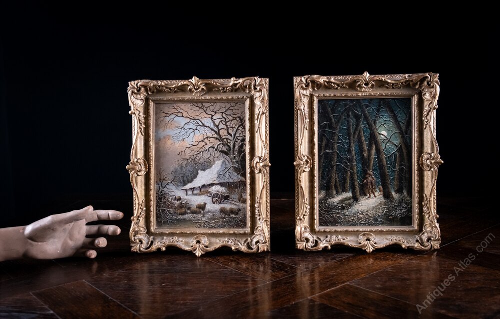 A pair of oils on boards depicting a snowy barn at dusk and a moonlit woodland scene. Both by the same hand. Both illegibly signed. The date of '1838' is just legible to the lower right of the barn scene.Both works are extremely well done with the artist displaying real skill in their depiction of light. In the barn scene in particular, the artist has used thickly applied paint and brush strokes to provide an almost three dimensional depiction of the thatched barn roof and straw in the wheelbarrow, giving the viewer a real sense of texture and depth.