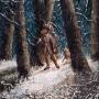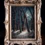 The woodland scene at first glance appears dark and atmospheric but at a closer look, the viewer is treated to an extremely joyful dog bounding behind his master as he collects sticks under moonlight.