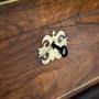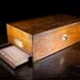 The lid has two small brass holes in which a book stand can be placed. The original bookstand remains present and fits perfectly as it should. Hidden drawer to the left side pops and returns when released without issue. The continuity of brass inlay to the side drawer area is of particular note.