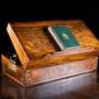 The lid opens to reveal a large green leather writing slope with inner compartments to both sides and recesses for pens and inkwells.