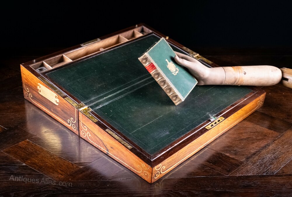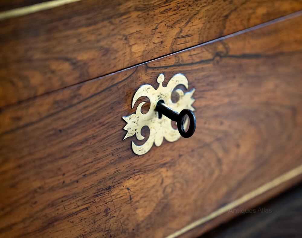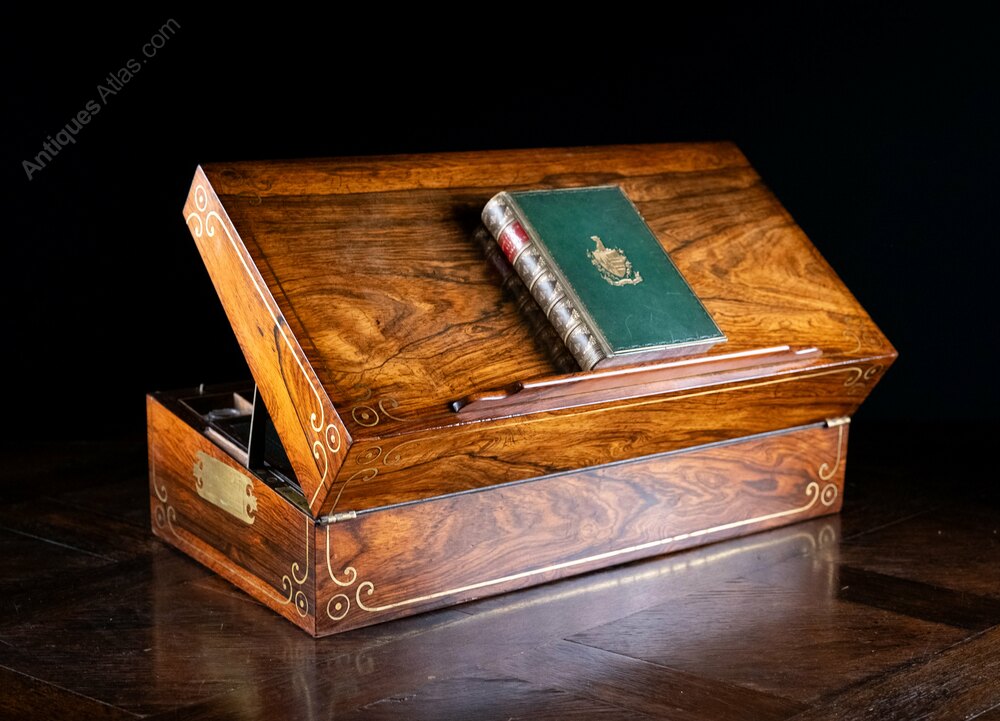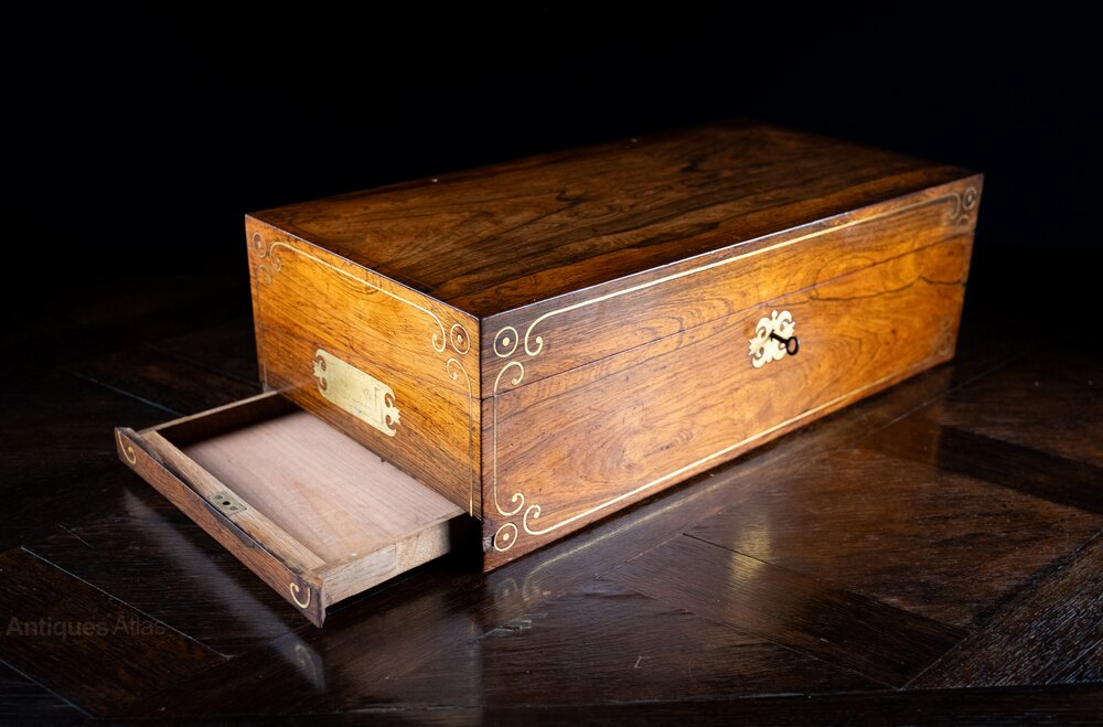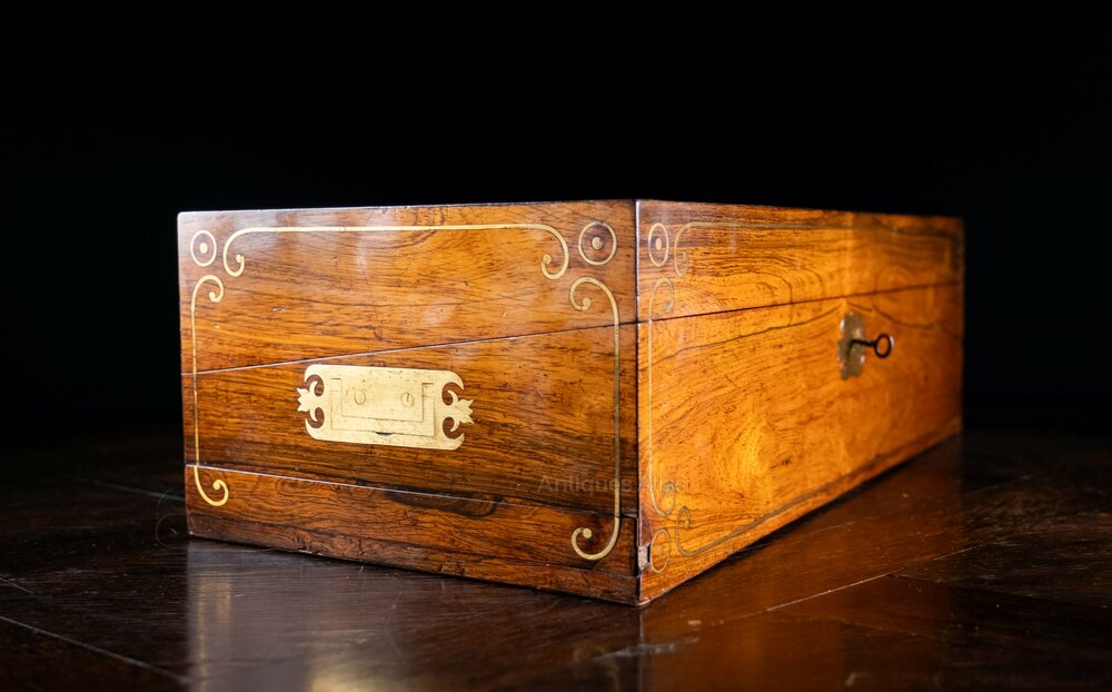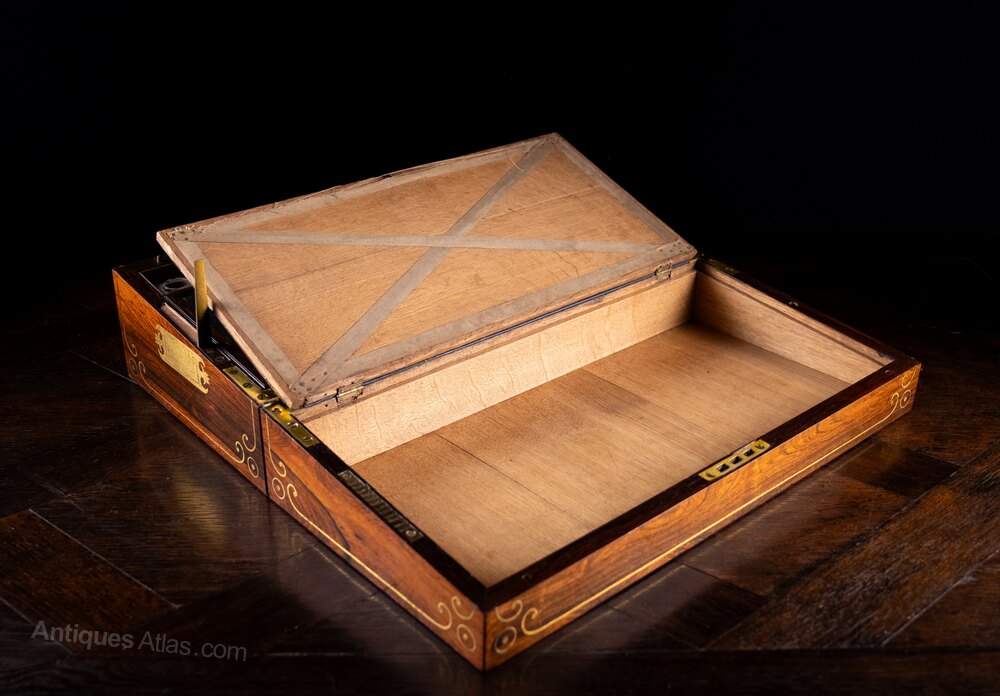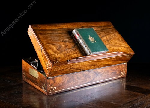 A superb early 19th century rosewood and brass inlaid writing slope / table desk of monumental proportions at over half a metre wide.The exterior boasts exceptional graining with continuity ensured at every join. The brass inlay has hints of Anglo-Indian influence with swirls and circles to each corner of the box. Brass escutcheon and brass campaign handles. Key absent.