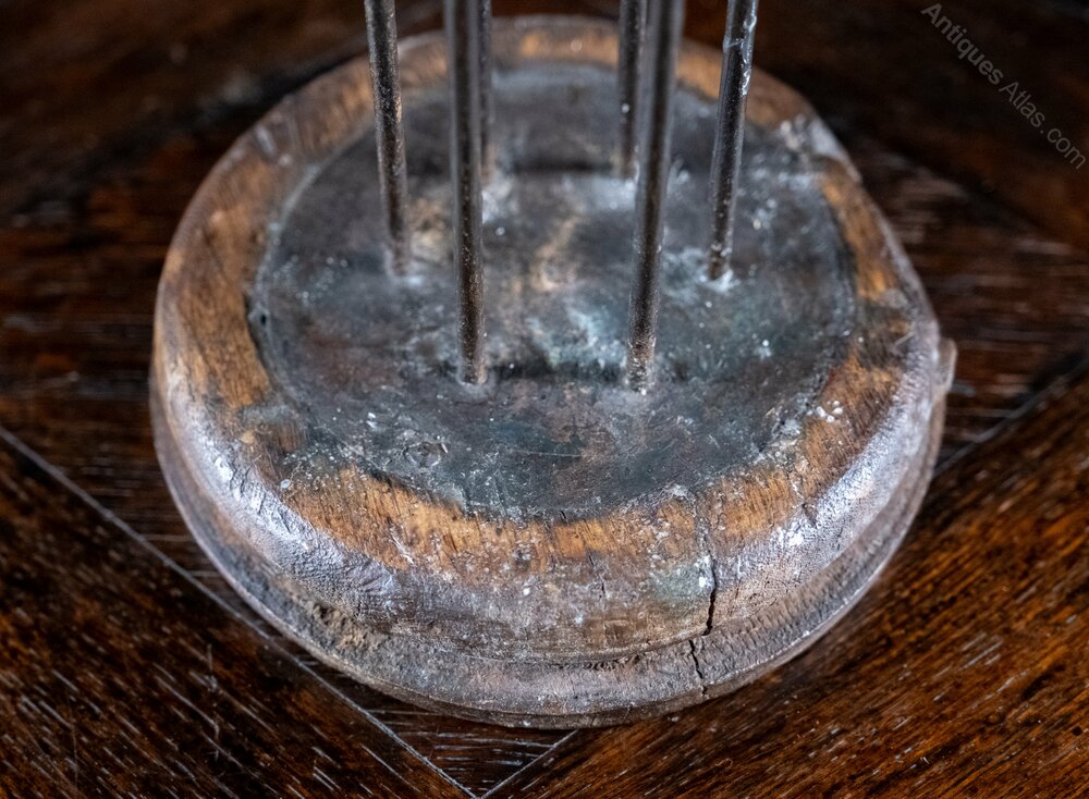 A rare 18th century stable or 'birdcage' adjustable candle holder of large proportions.The adjustable candle holder sits within a frame with a shaped carrying handle to the top and above a turned wooden base. The candle holder is in a good honest untouched condition, still with remnants of wax throughout the interior and speckled to the base.