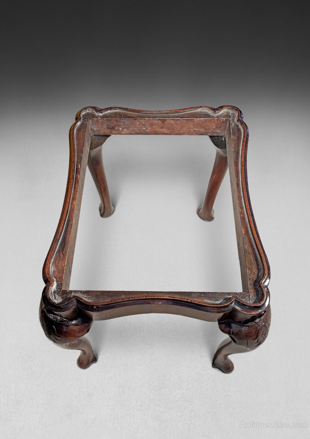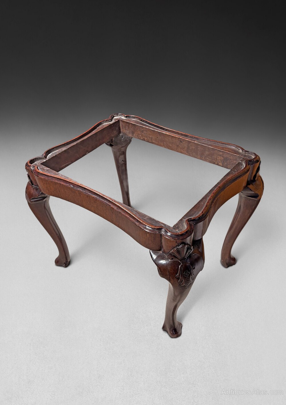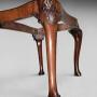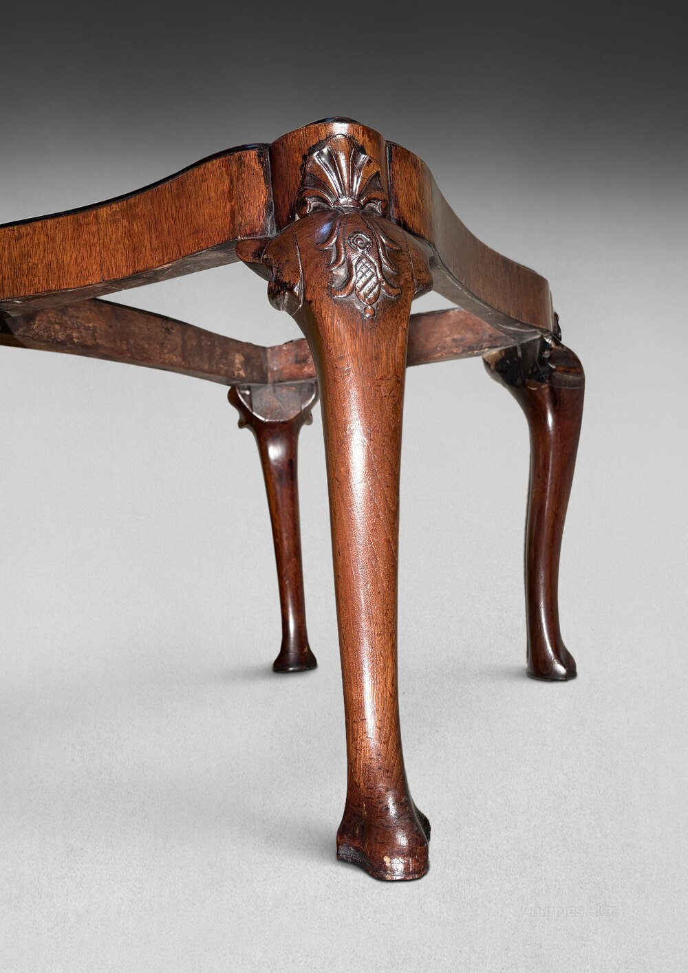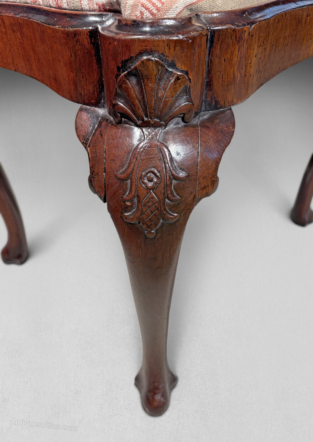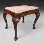 No:11219A mid 18th century Mahogany stool of serpentine shape with a drop-in cushion above the shaped frieze, the whole raised on cabriole legs with shell and bell flower carved cartouches to the knees and terminating in trefoil toes.