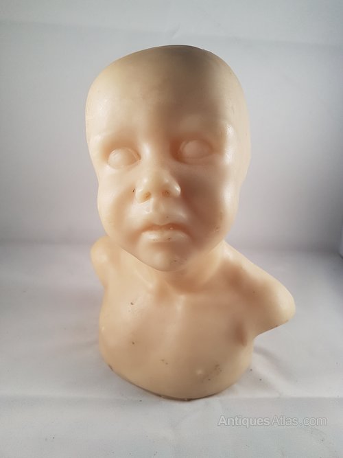 This is a very decorative item and at the same time slightly odd as it a childs head & upper torso. It is the wax mold used for lost cast casting method for casting sculptures etc in various metals, these ones tended to be bronze or spelter. It ias marked up on the cap of the head with ‘cut out along line and keep for firing’ also ‘Wolf Gormanns Design’ ‘903’ indistinct stamp and ‘ 01 96’. Measures 22cm high by 17cm wide and 15cm deep.DateEarly 20th Century :