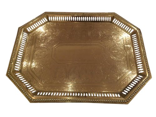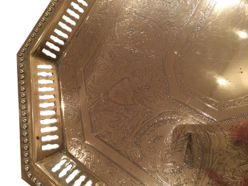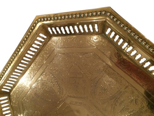A beautiful and ornate late 19th century galleried and engraved brass tray by Joseph Sankey and Son, circa 1890.47cm w x 36cm d