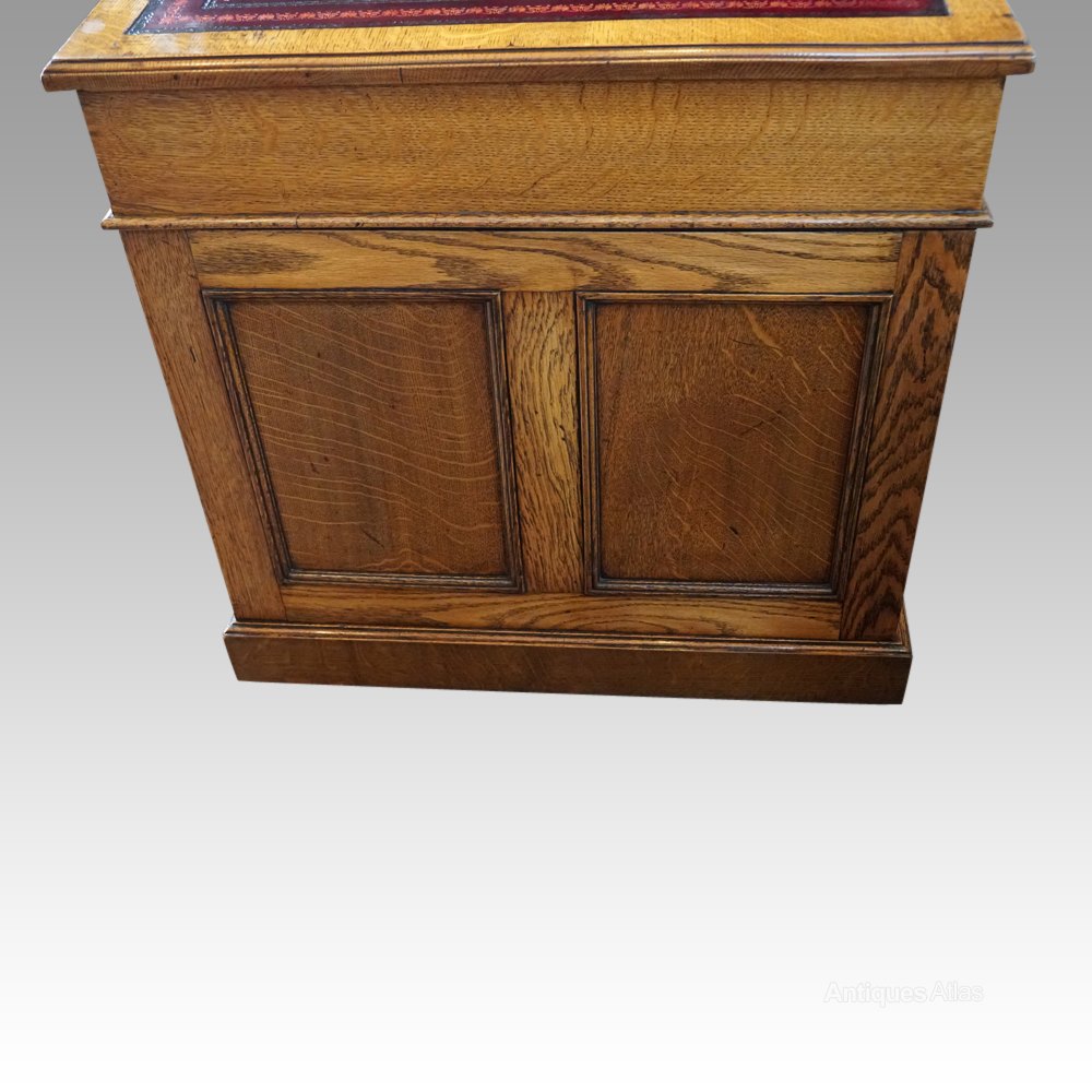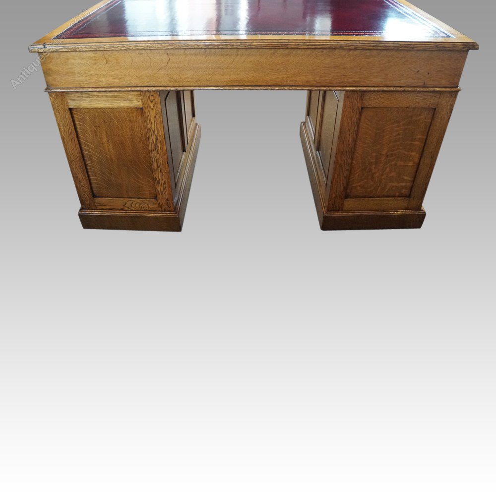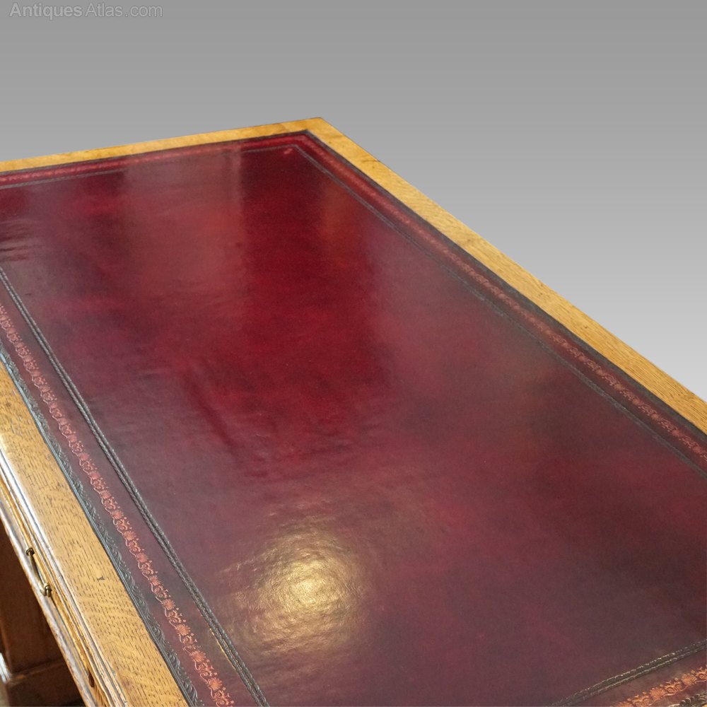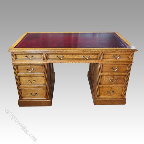 Victorian oak pedestal deskThis Victorian oak pedestal desk we attribute to being made and retailed by Maple & co.