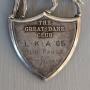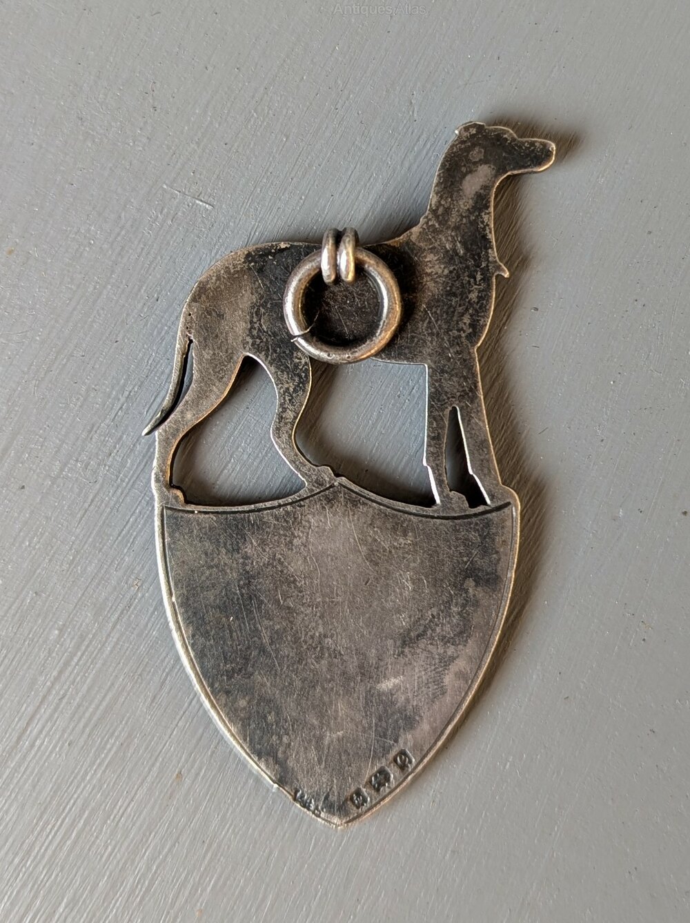 A nicely detailed silver collar medal for The Great Dane Club.Hallmarked for Birmingham, 1904 and by maker Vaughton & Sons, the medal measures approx 6cm high by 3cm wide. It has a silver loop to the reverse, marked with the lion passant, for attaching to either a collar ring, or to use as a silver fob on a watch chain.