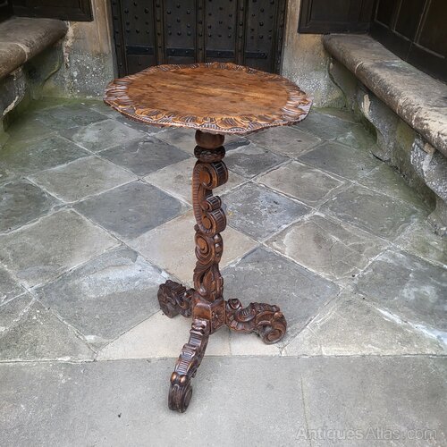 This exquisite antique Italian tripod table, crafted from linden wood, is a stunning example of fine craftsmanship and classical elegance. Offered for sale by Hutton-Clarke Antiques, this piece showcases intricate hand-carved details throughout its design.The table features a beautifully shaped scalloped-edge top, supported by a highly decorative central column adorned with elaborate scrollwork and floral motifs. The tripod base extends into gracefully curved legs, each meticulously carved with intricate patterns that enhance the table’s sophisticated aesthetic.
