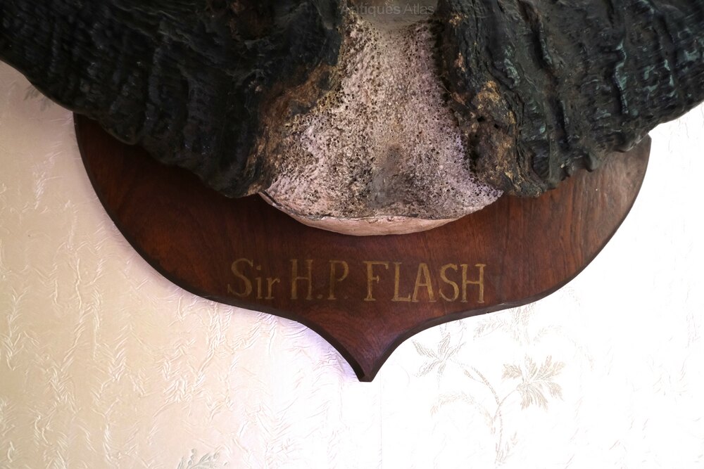 A striking pair of antique Cape buffalo horns, mounted on a polished mahogany shield, circa 1890 and inscribed “Sir H.P Flash” in traditional gilt lettering. The horns retain a superb natural texture and deep patina, creating a bold and authentic presence. A fine example of big-game taxidermy, capturing the spirit of Edwardian adventure and the era’s fascination with safari trophies. Ideal for a study, country house, or collector of colonial antiques.Height 46 cm, width 79 cm, depth 32 cm