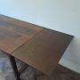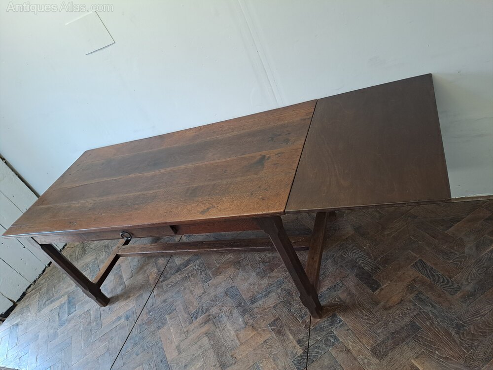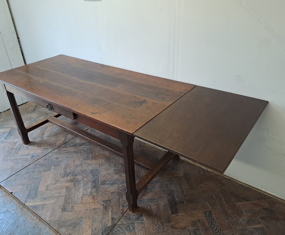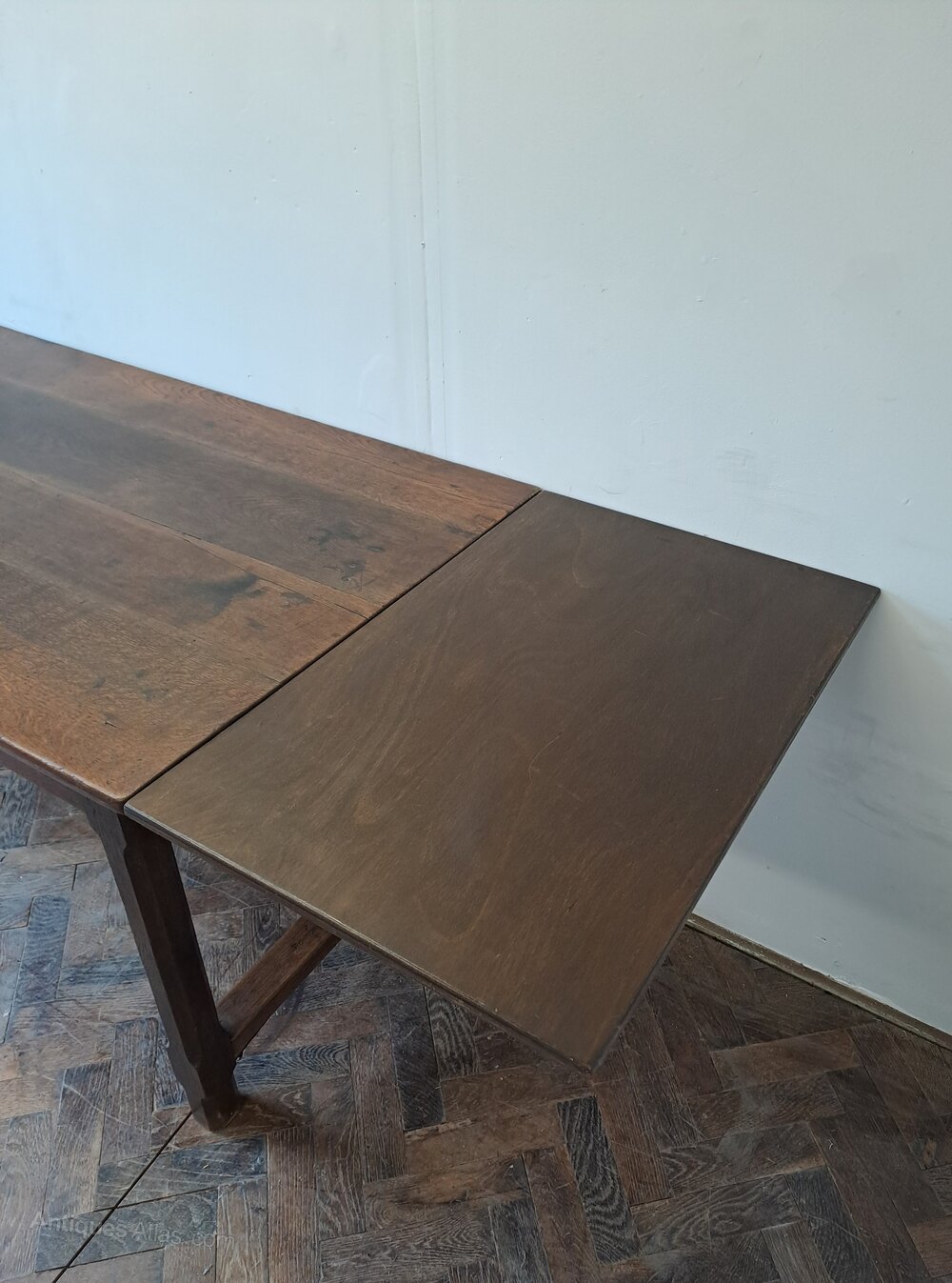 The table stands on chamfered square legs, united by a strong H-form stretcher, giving both visual balance and excellent stability. The underside shows a useful slot for extension leaves, making it practical as well as decorative.