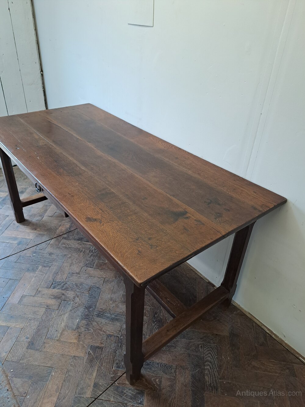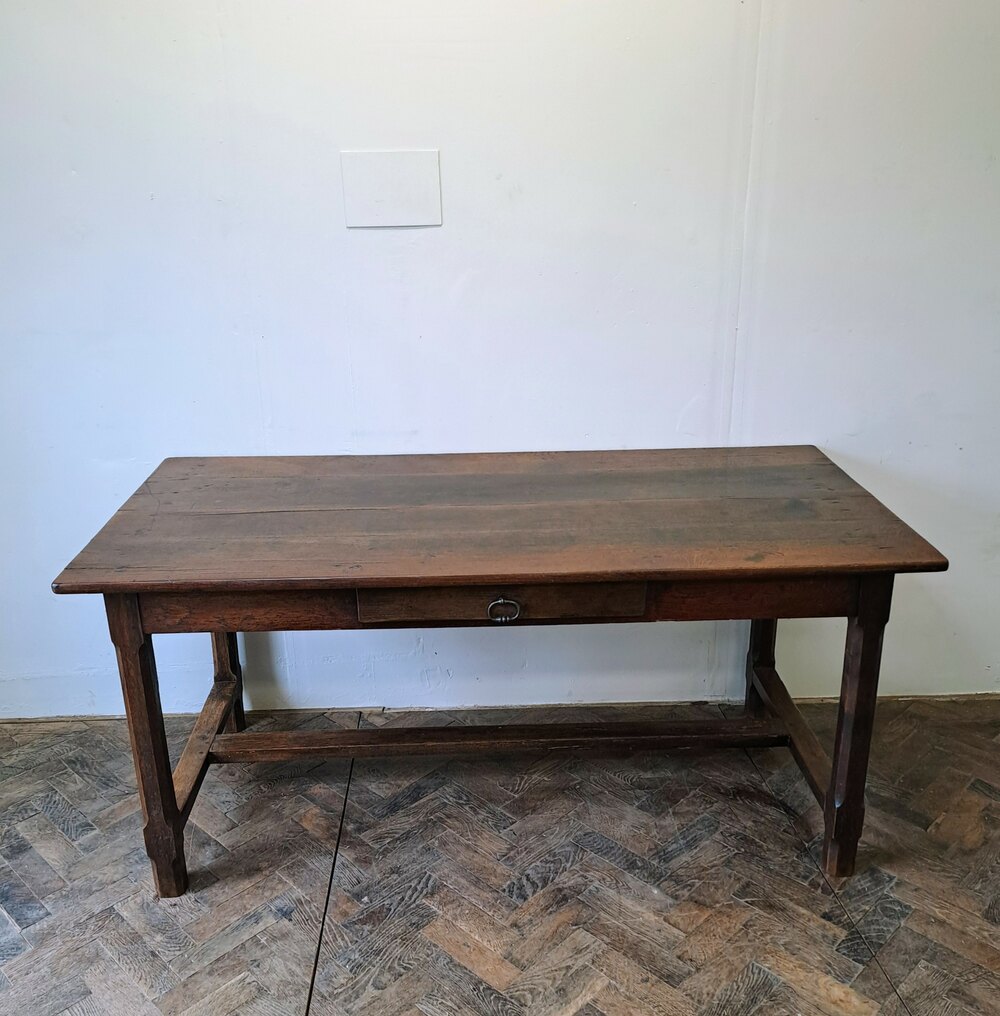 A French oak farm table, simple, honest, and full of character, with excellent colour and practical proportions.Constructed in solid oak, the table features a well-worn plank top with a rich, warm patina developed through years of use. The single drawer set into the frieze retains its original iron pull and provides useful everyday storage.