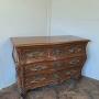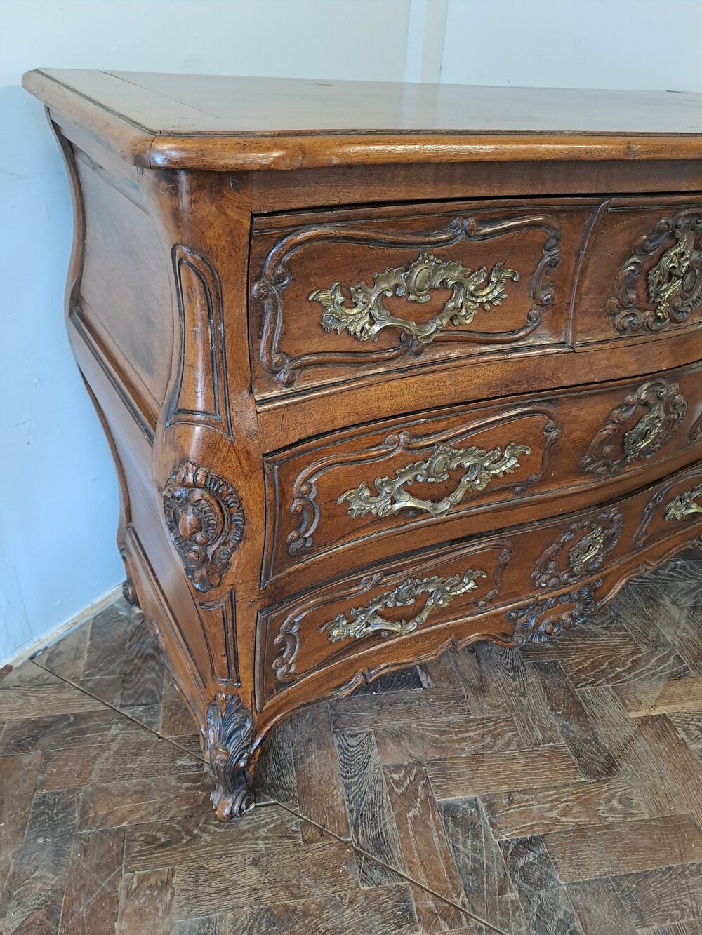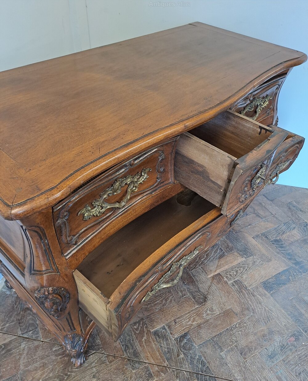 A handsome early 20th-century French walnut commode, made in the 18th-century manner, beautifully proportioned and richly detailed.Constructed in solid walnut throughout, the commode features a gently bombé façade with three short drawers to the upper register over two long graduated drawers below, all framed by finely carved mouldings. The drawer fronts are adorned with rococo-inspired relief carving and fitted with ornate gilt-bronze handles and escutcheons, well modelled in the Louis XV taste.