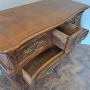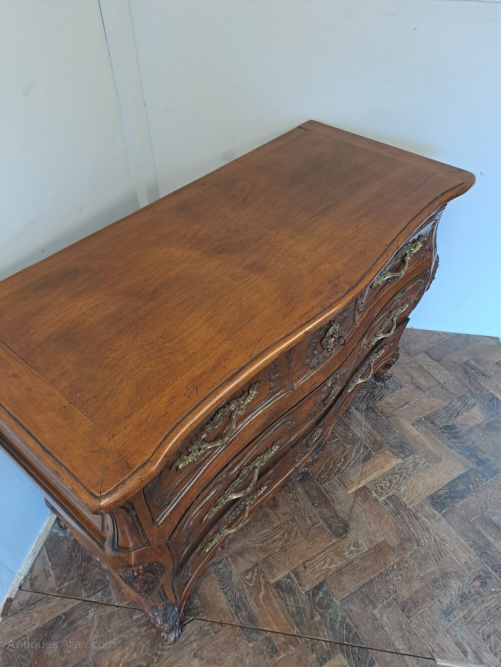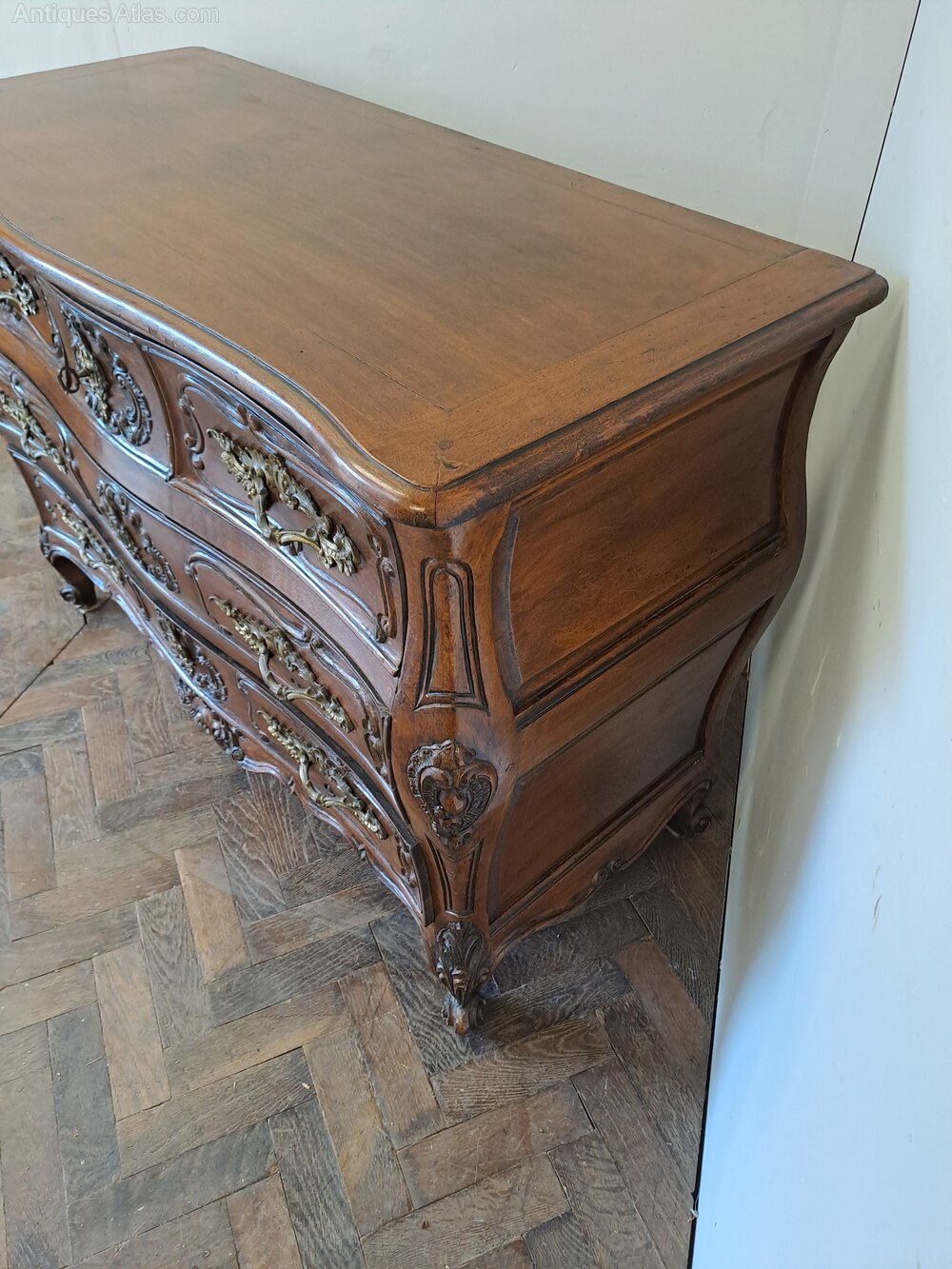 The subtly shaped sides are centred with carved reserves and flow down to elegant scroll feet, while the shaped apron is enriched with further carving. The softly moulded top follows the curve of the carcass and displays a warm, well-developed patina.