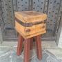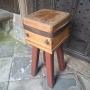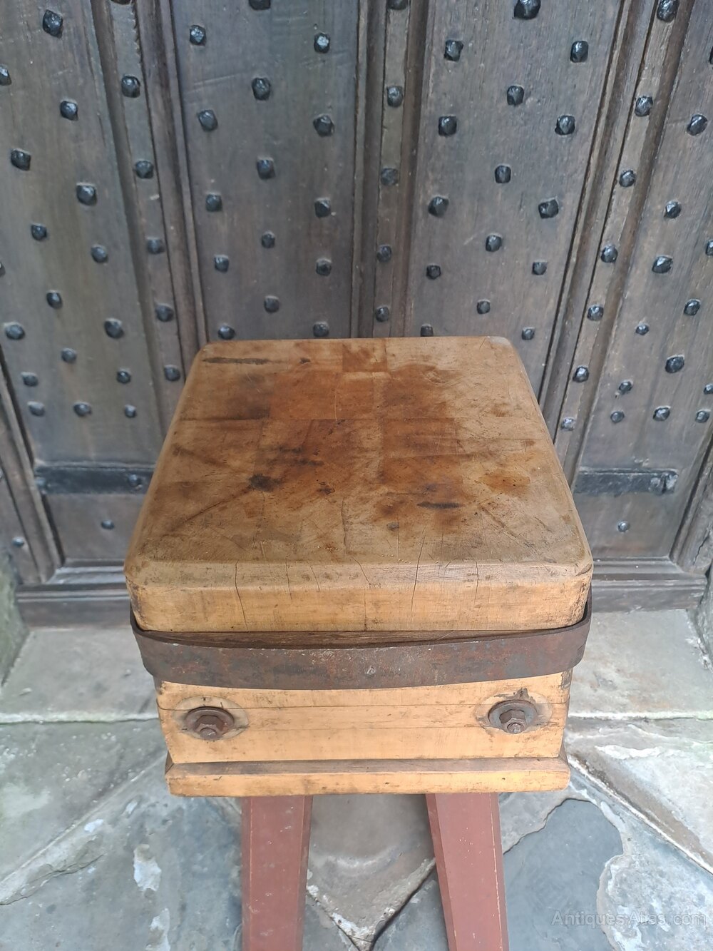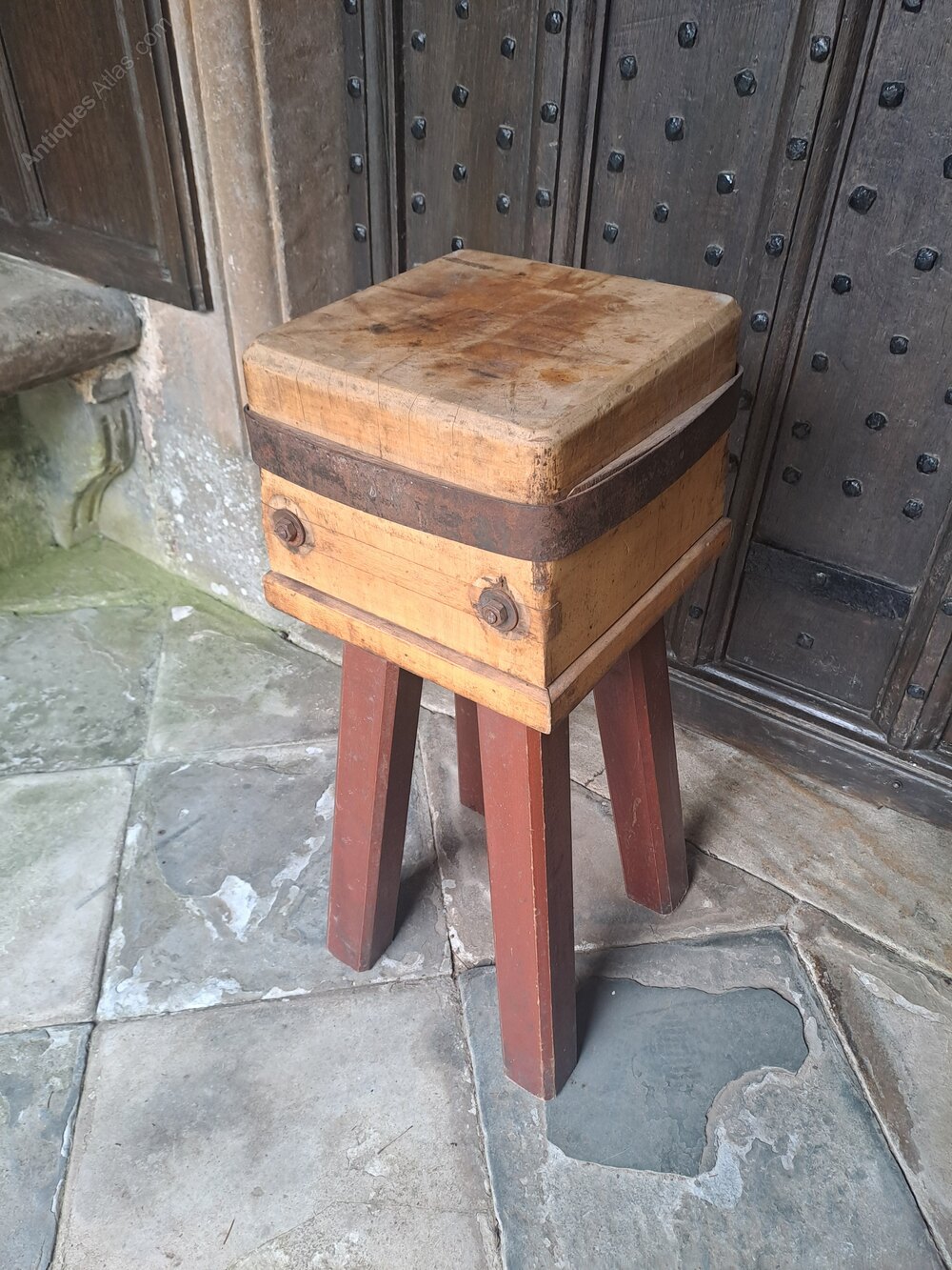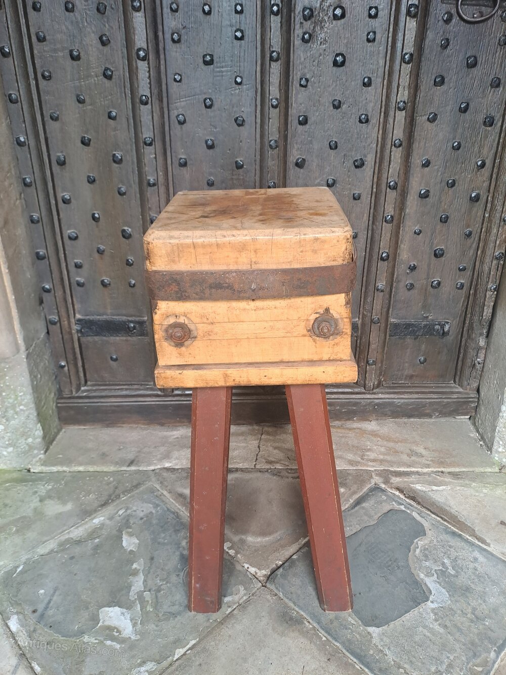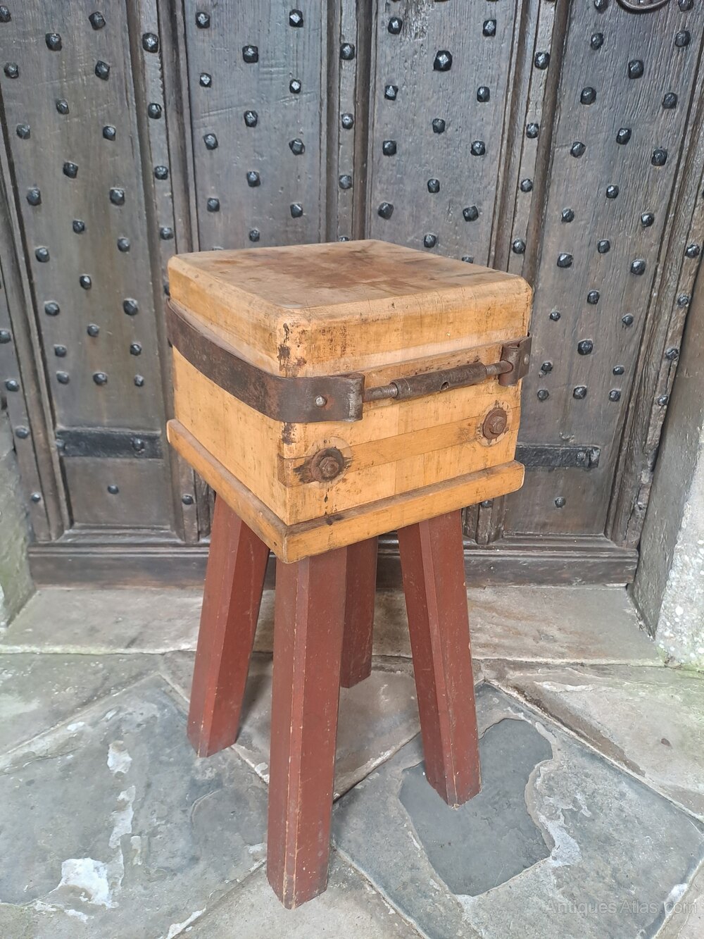 Hutton-Clarke Antiques is pleased to offer this exceptional 19th-century Continental beech butcher’s block, a rugged and highly decorative piece repurposed as a sculptural side or lamp table. Featuring a thick, end-grain top with a superb weathered patina, the block is secured by its original heavy-duty iron strapwork and tension bolt. Raised on a sturdy tripod base with chamfered legs retaining an attractive historic oxblood-red finish, this piece perfectly balances industrial strength with rustic charm, making it a versatile statement for a contemporary kitchen, boot room etcHeight 74 cm , width 33 cm